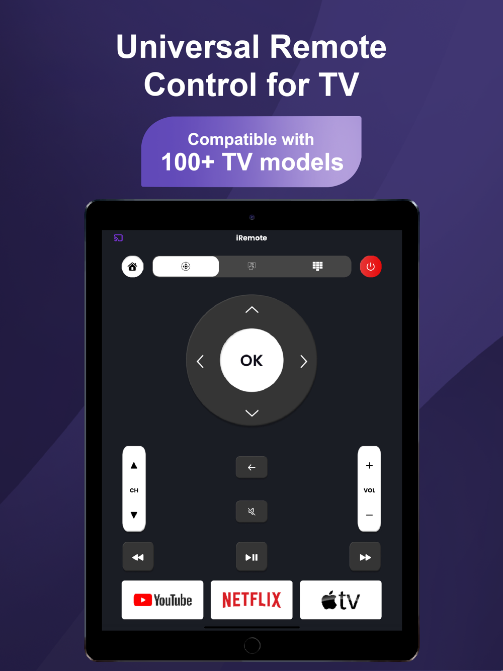 iRemote - Remote Control for TV is an app that help users to control their TVs without using their physical remote controls. iRemote app supports hundreds of TV models with various operating systems and screen resolutions, ranging from basic models no longer in manufacture to today novelties with the most powerful hardware.