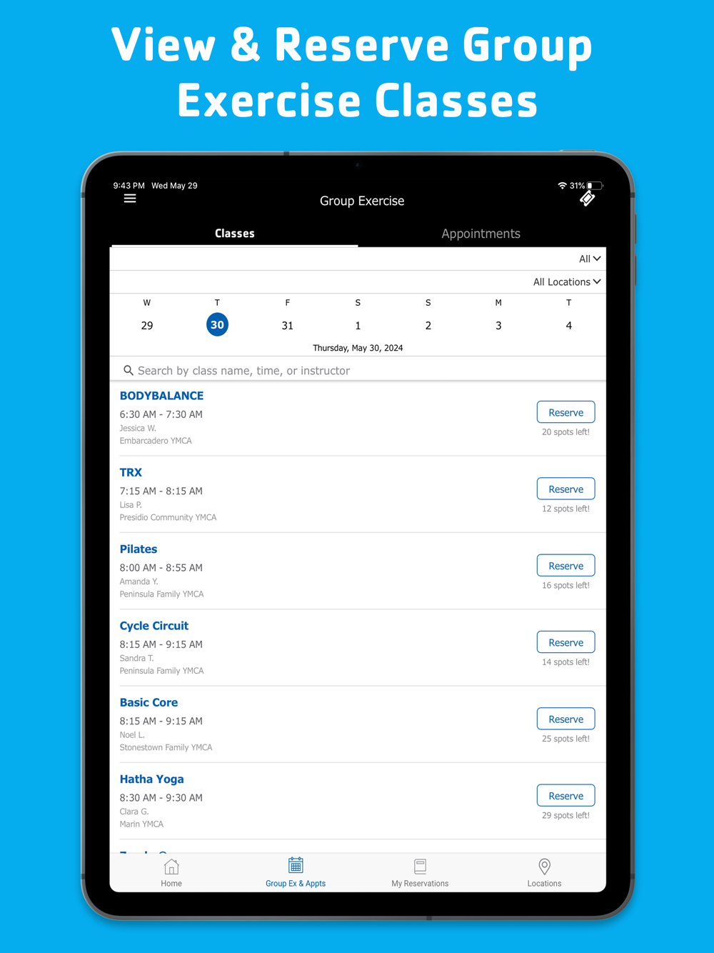 View, search and reserve group exercise classes and paid small group fitness classes.