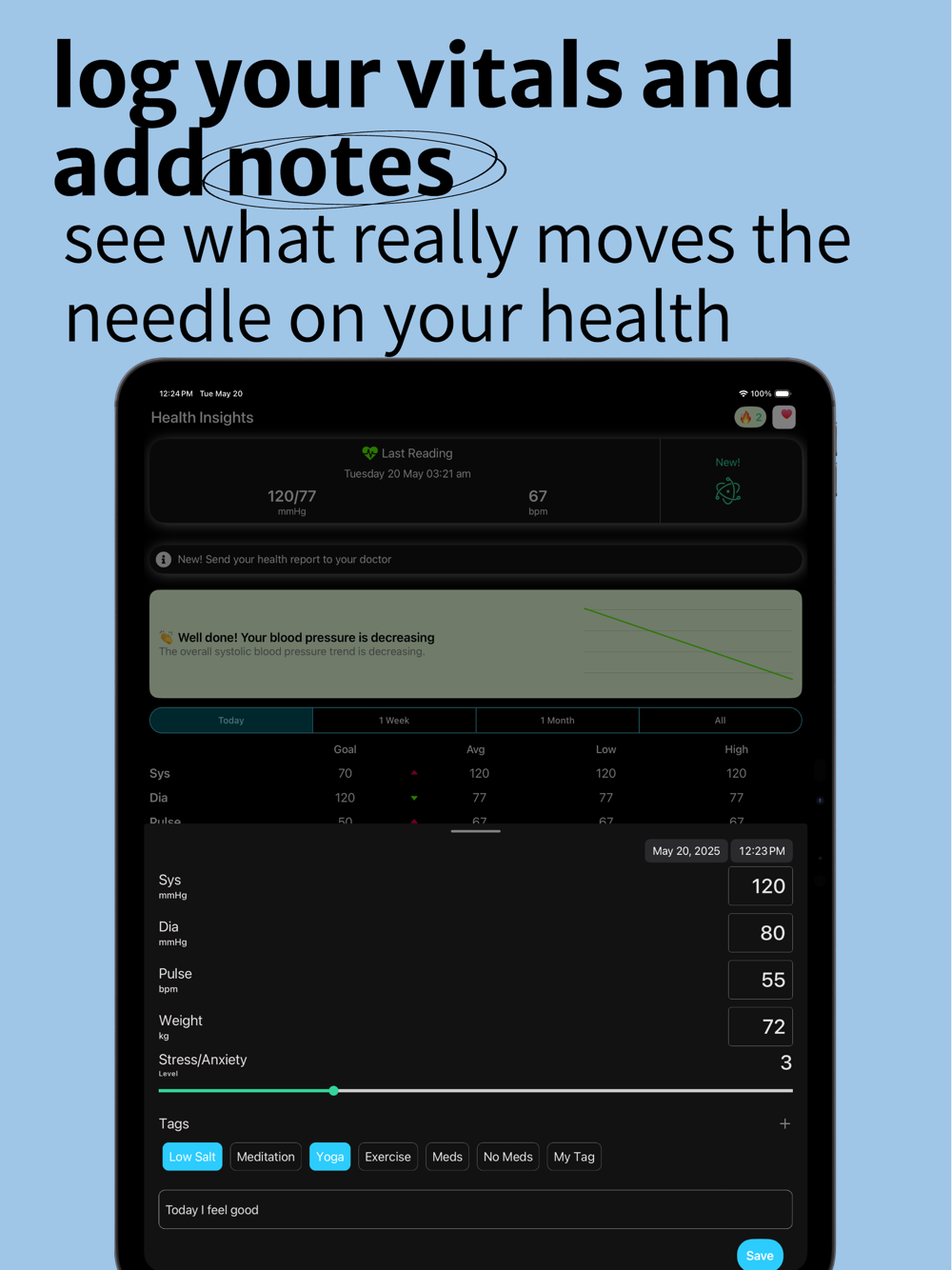 Personalized Tags and Notes: Add notes and tags to each bp measurement to track the details that matter most.