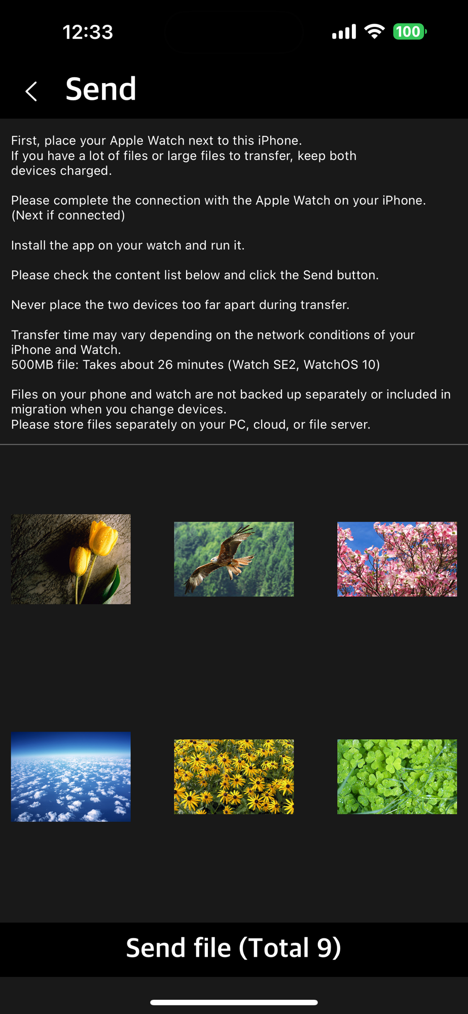 The iPhone app transfers image files and photos to a connected Apple Watch.