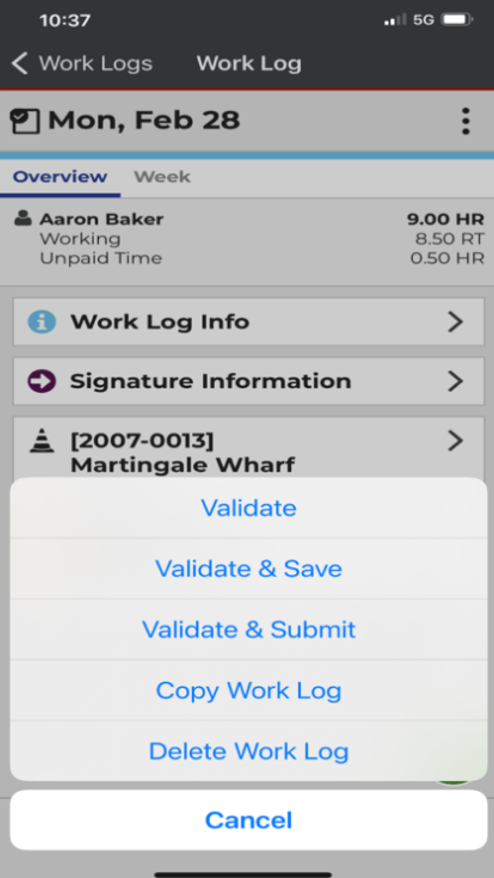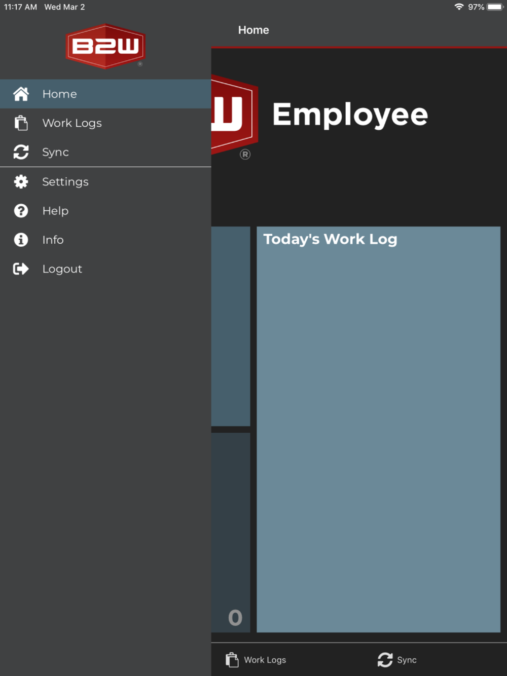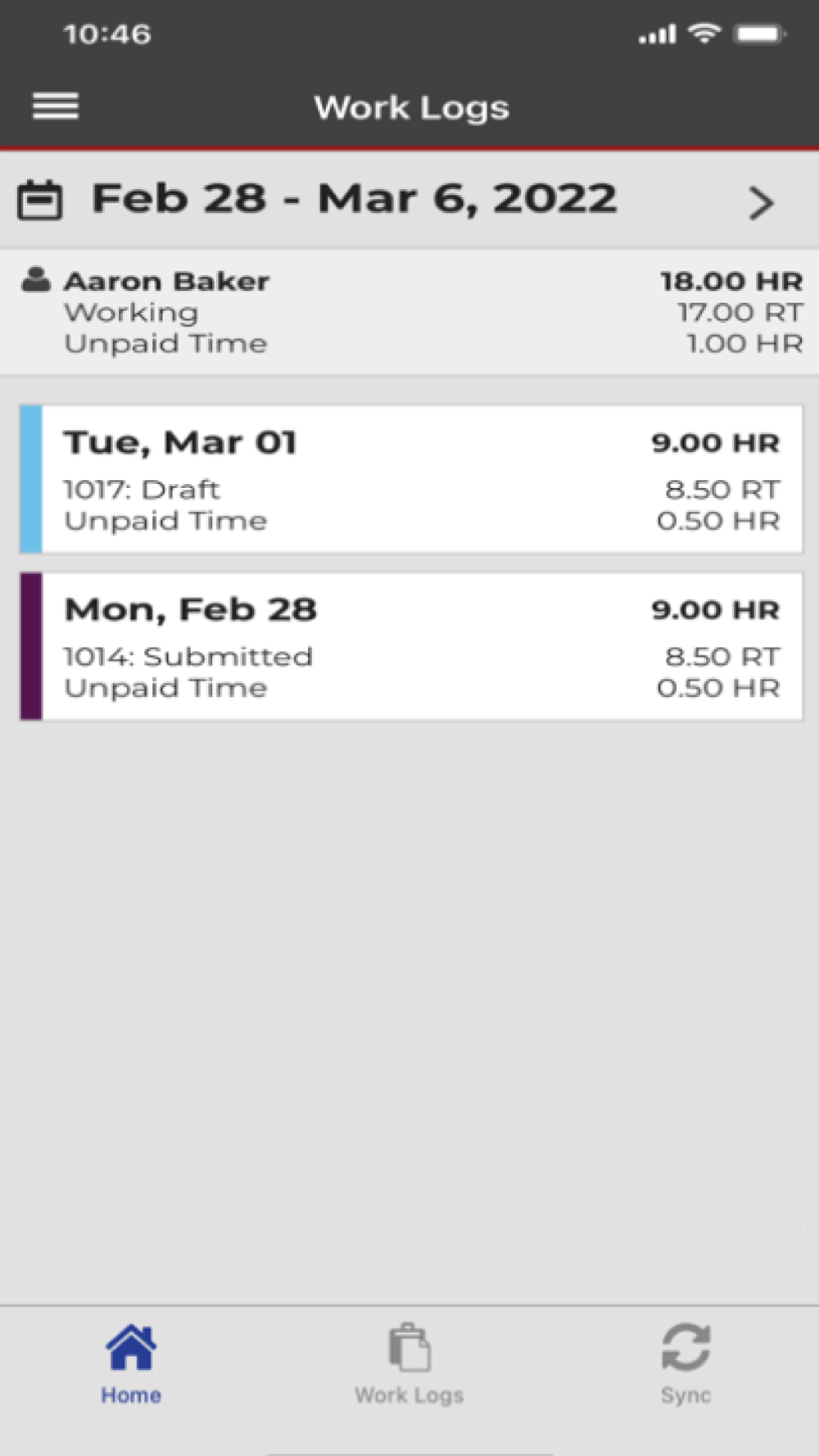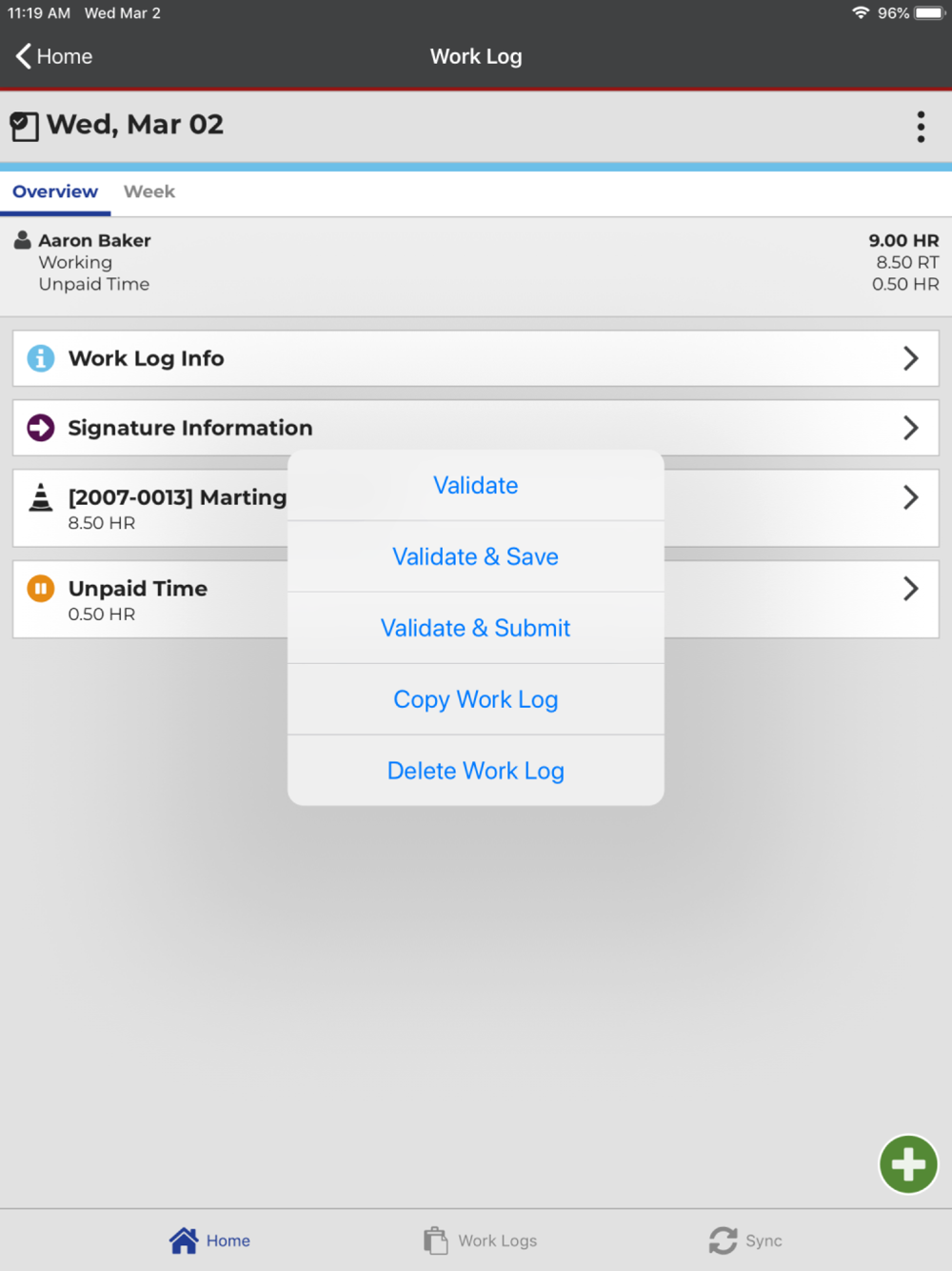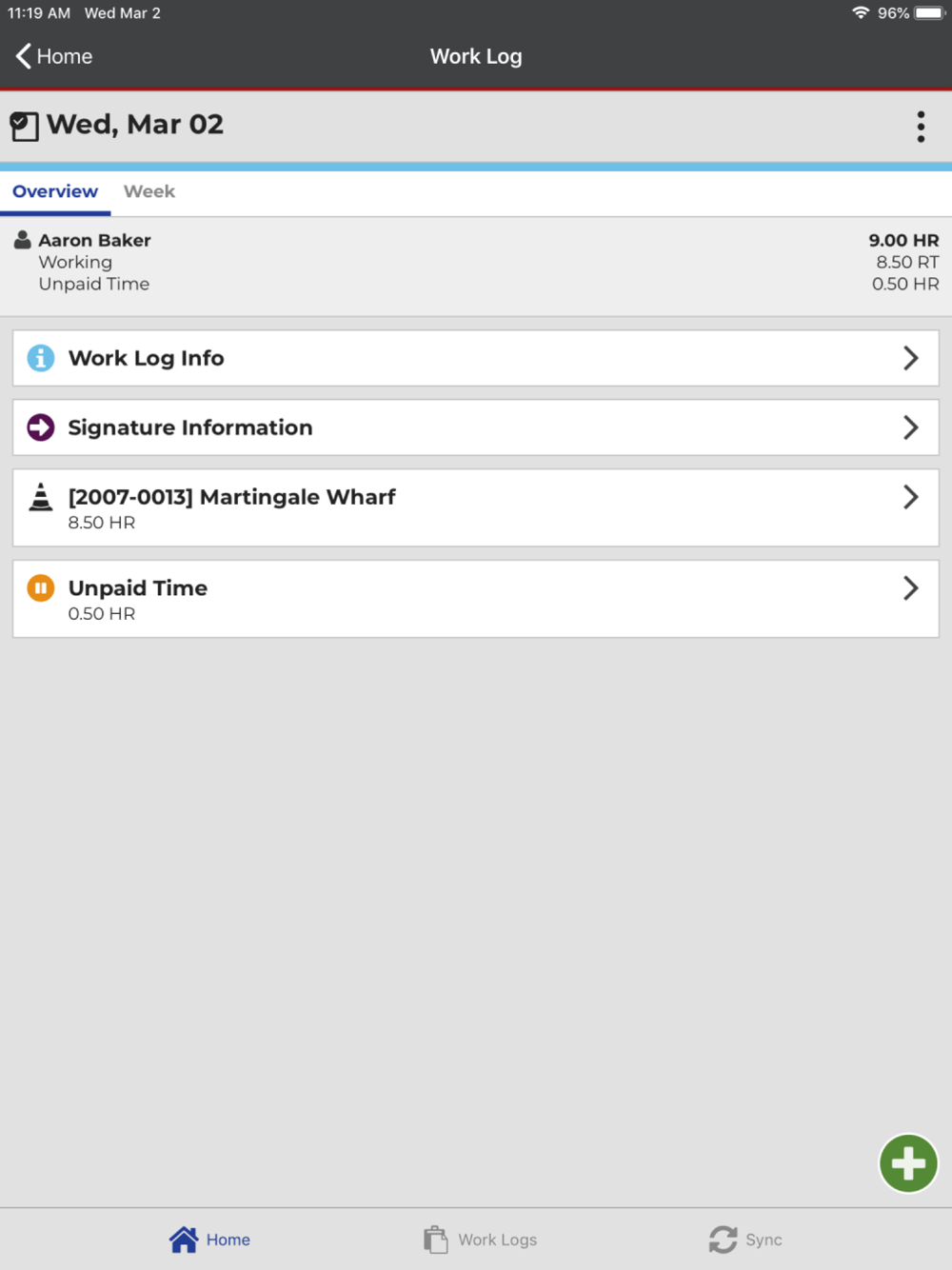 Employees create daily work logs for tracking time and work activities, and can use the app in a real-time, online mode or create and modify work logs offline and send them to a server when a connection is available.