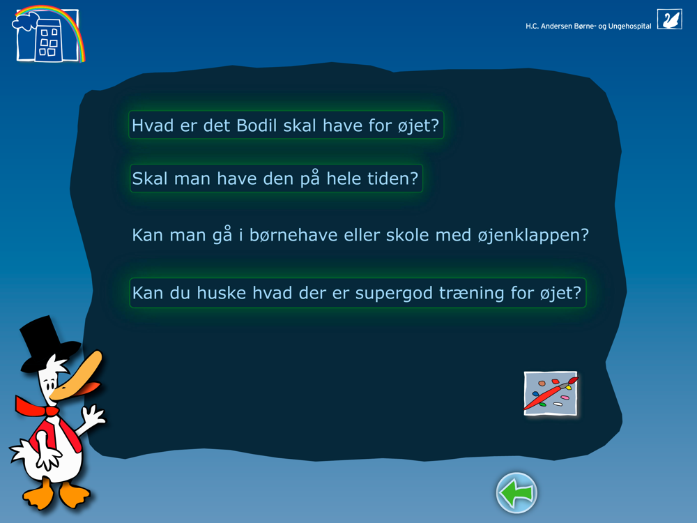 I "HC And - Øjenafdelingen" formidles generelle patientforløb/undersøgelser på Øjenafdelingen. Informationen er med speak - af en barnestemme - og animation i genren ”Læring gennem leg med tablet/mobiltelefon/touch-skærm”.