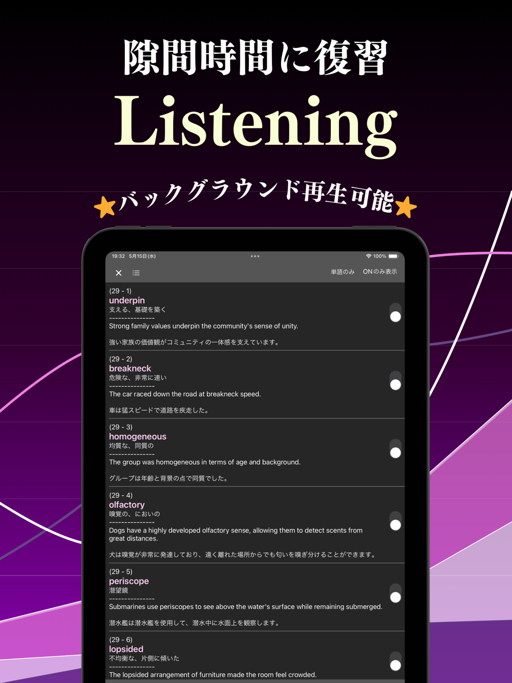 アメリカ英語、イギリス英語、オーストラリア英語、インド英語の4種類の発音で、全単語・例文の音声学習が可能。多様なネイティブスピーカー発音に触れられ、リスニング力も向上します。リスニングではバックグラウンド再生が可能です。
