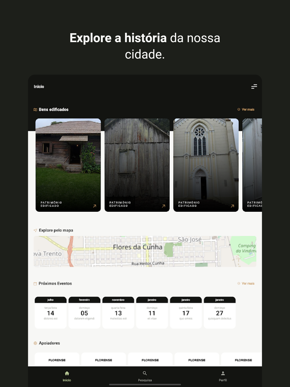 O app "Inventário Flores da Cunha" é um aplicativo interativo que destaca o patrimônio cultural material da cidade de Flores da Cunha. Com um catálogo de mais de 80 edificações históricas, o app disponibiliza uma galeria de fotos, descrições técnicas, informações sobre eventos culturais e um mapa interativo para facilitar a localização das edificações. A funcionalidade de visualização tridimensional do aplicativo utiliza a tecnologia de *Gaussian splatting*, proporcionando aos usuários uma experiência imersiva e realista. Tudo isso em uma interface moderna, minimalista que utiliza o atual estado da arte e tecnologia para dispositivos mobile.