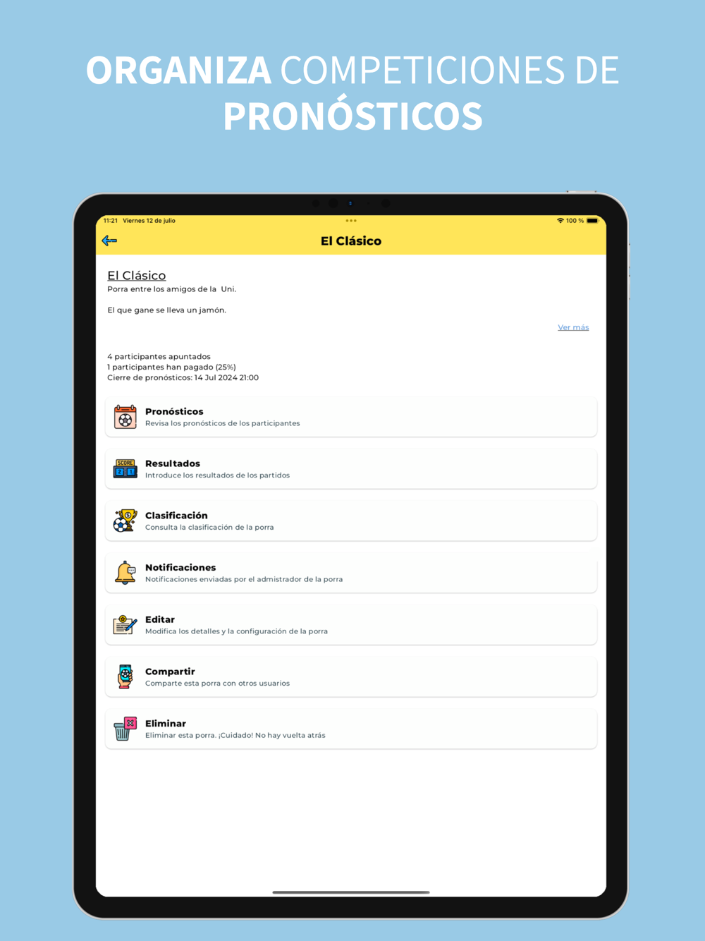 - Invita a amigos a unirse a tus porras mediante enlaces compartidos.