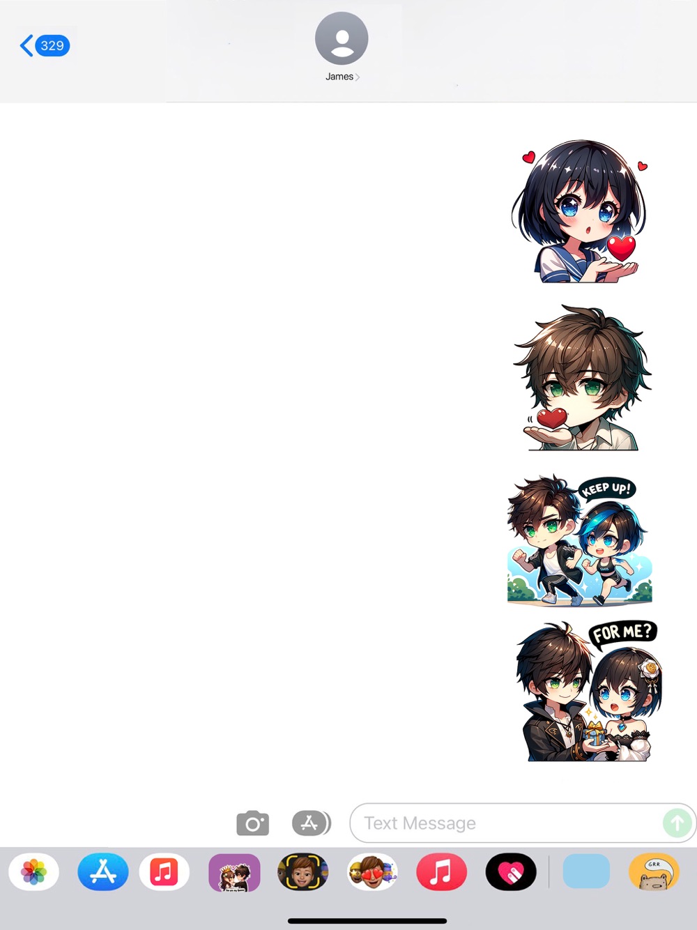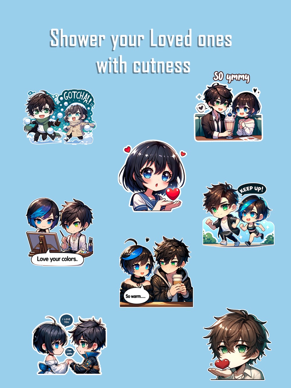 Introduce a touch of romance and fun to your chats with "Luna and Zane, Kawaii Couple Stickers"! This adorable sticker pack features the charming couple, Luna and Zane, in various cute and heartwarming scenarios. Perfect for expressing love, joy, and all the little moments in between, these stickers are designed to make your messages more engaging and delightful. Share the love and let Luna and Zane add a sprinkle of kawaii magic to your conversations. Download now and bring a smile to your chats!