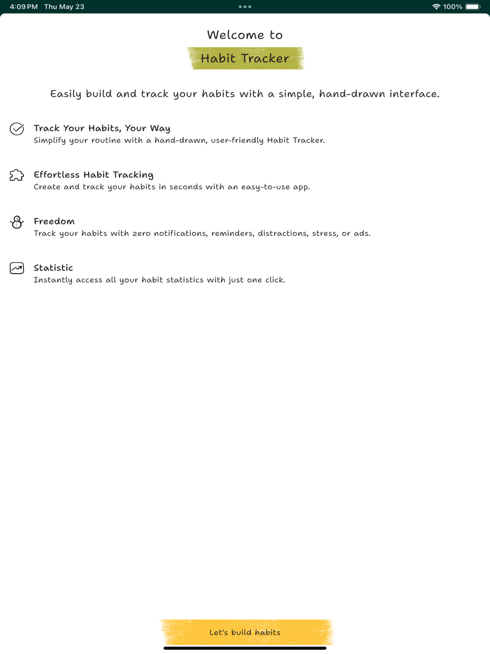 Welcome to our Habit Tracker app, your companion for effortlessly cultivating new habits. With its intuitive hand-drawn interface, simplicity is key - no notifications, reminders, distractions, or ads to disrupt your focus.