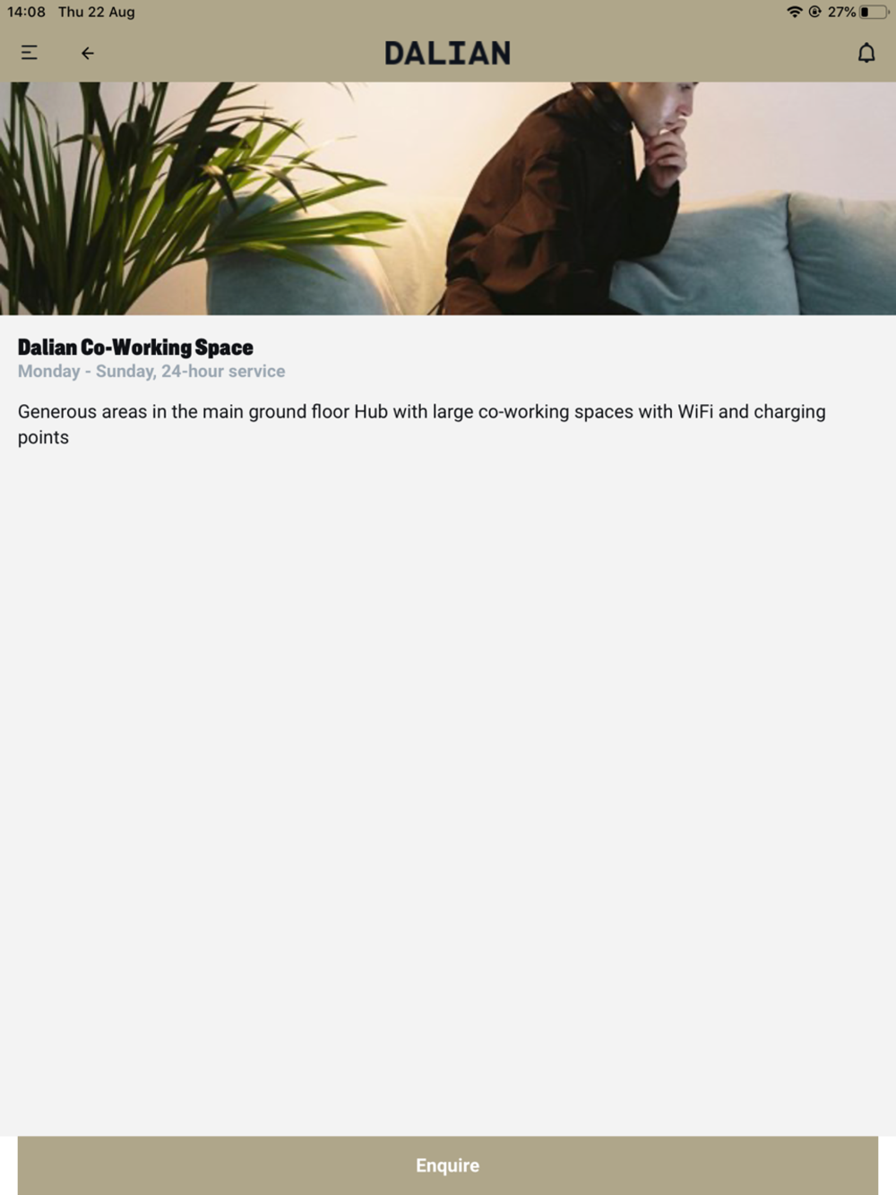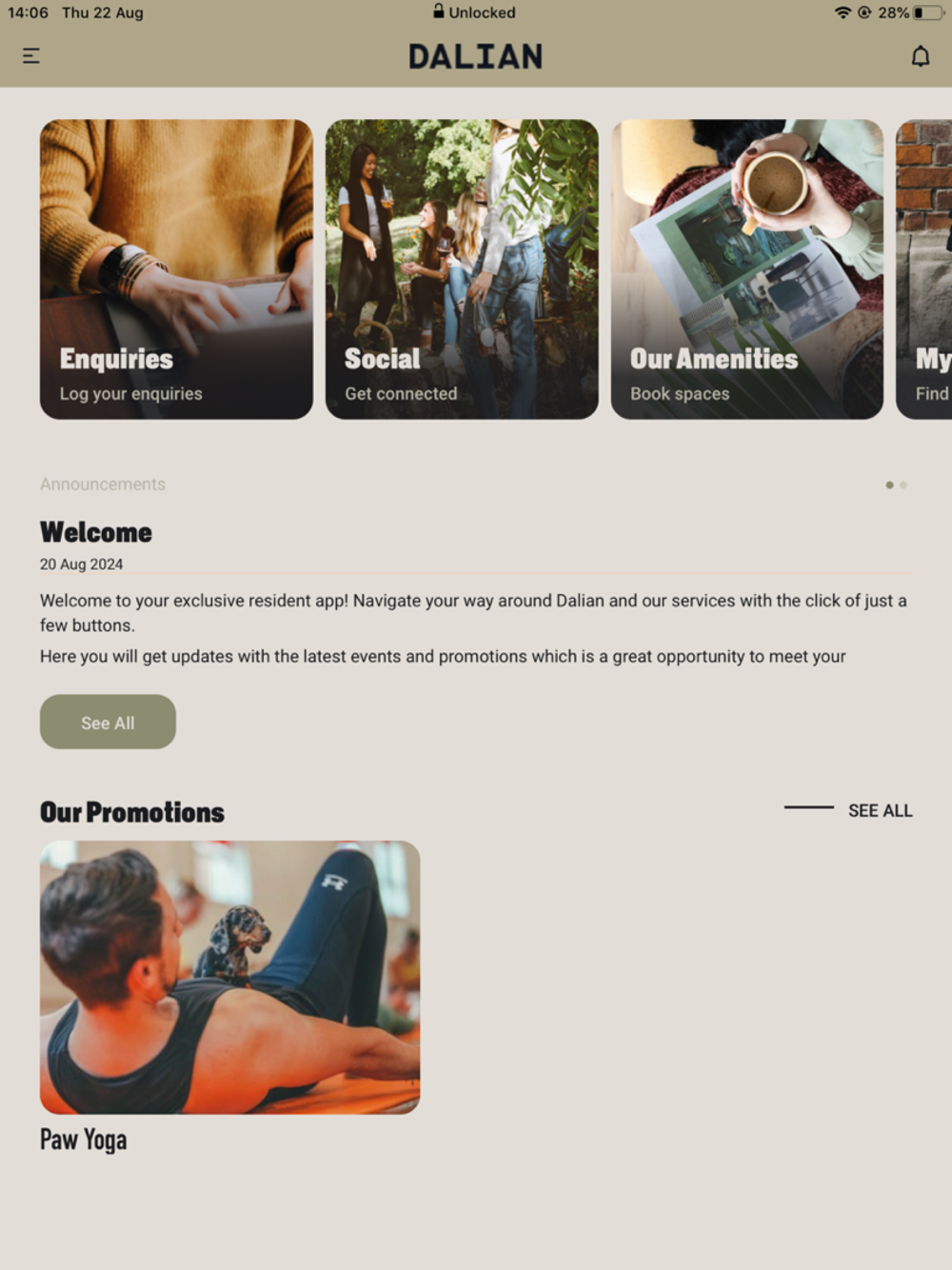Get the lowdown on the range of on-site resident amenities, book the private dining space or log a maintenance request. Stay up to date with news, promotions, and upcoming events. Our resident's app will save you time to focus on the more important aspects of life at Dalian.