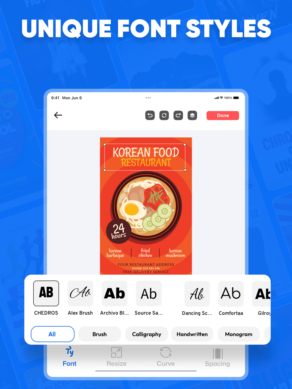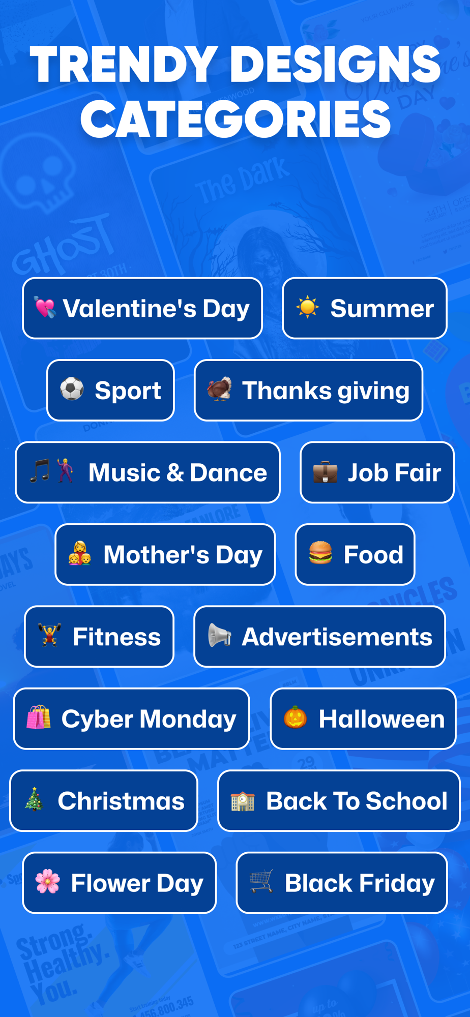 Our app is packed with an extensive library of backgrounds, shapes, stickers, and fonts, providing you with all the tools you need to create unique and memorable designs. Choose from thousands of high-quality templates, each designed to be easily customizable to fit your specific needs. Whether you're promoting an event, advertising a product, or simply expressing your creativity, you'll find the perfect template to get started.