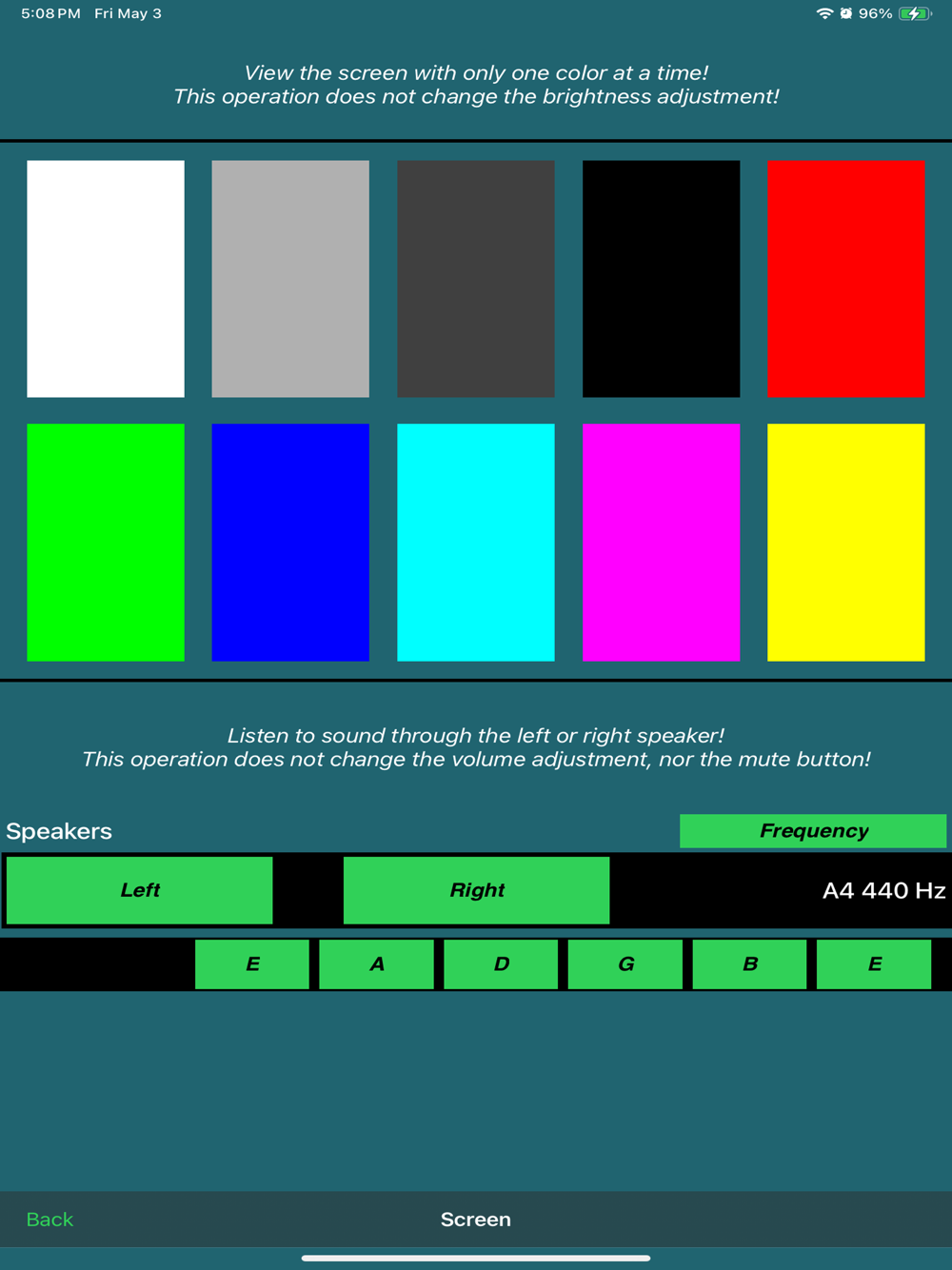 View the operation of your smart device's sensors. View basic information provided by the iPhone or iPad's gyroscope and X Y Z accelerometers, magnetometer, GPS location, altimeter and atmospheric pressure. View all screen pixels according to basic colors. Listen to the left and right speakers.
