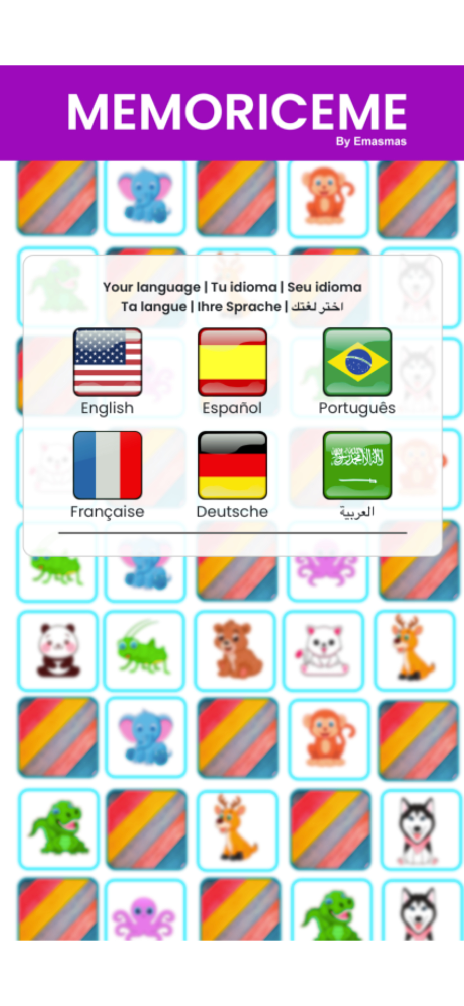 Memoriceme is an exciting memory game designed to challenge and improve your cognitive skills. Flip the cards and find the correct pairs while testing your memory skills. Enjoy multiple difficulty levels and play in different languages for an even richer experience. Are you ready for the challenge? Improve your memory and have fun with Memoriceme.