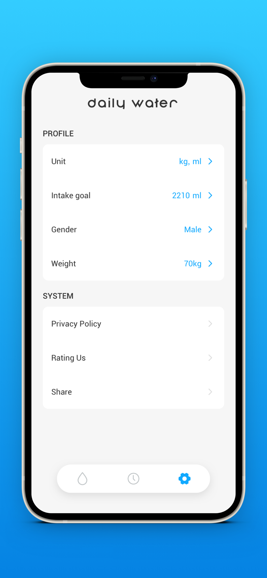 + Daily water intake calculator based on your gender, weight. Lets you know how much water you should drink each day.