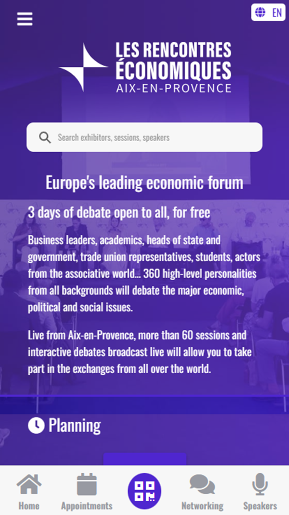 Application des Rencontres Économiques d’Aix-en-Provence 2025 mettant en avant les conférences, les intervenants ainsi que le planning de l'évènement.