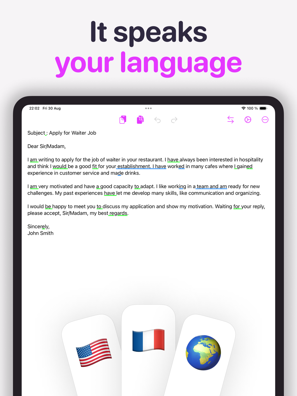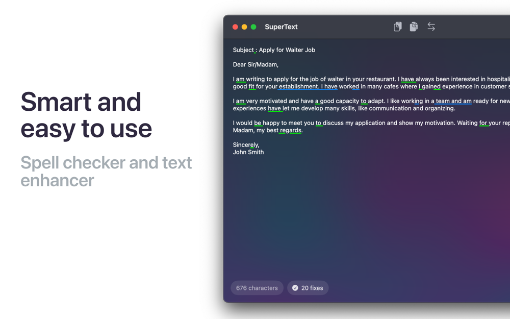SuperText is your intelligent spelling and grammar checker. Whether you're crafting a crucial cover letter, an important email, or a quick message, SuperText ensures your writing is polished, professional, and error-free. Focus on your message, and let SuperText take care of the details.