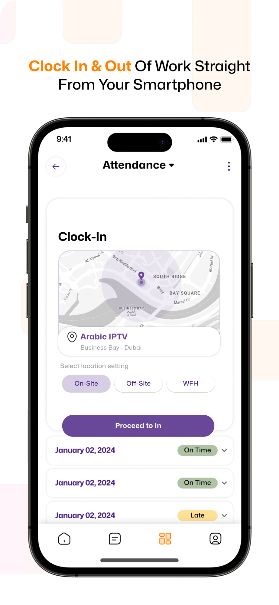 · Clock in/out of work, whether in the office, offsite, or WFH.