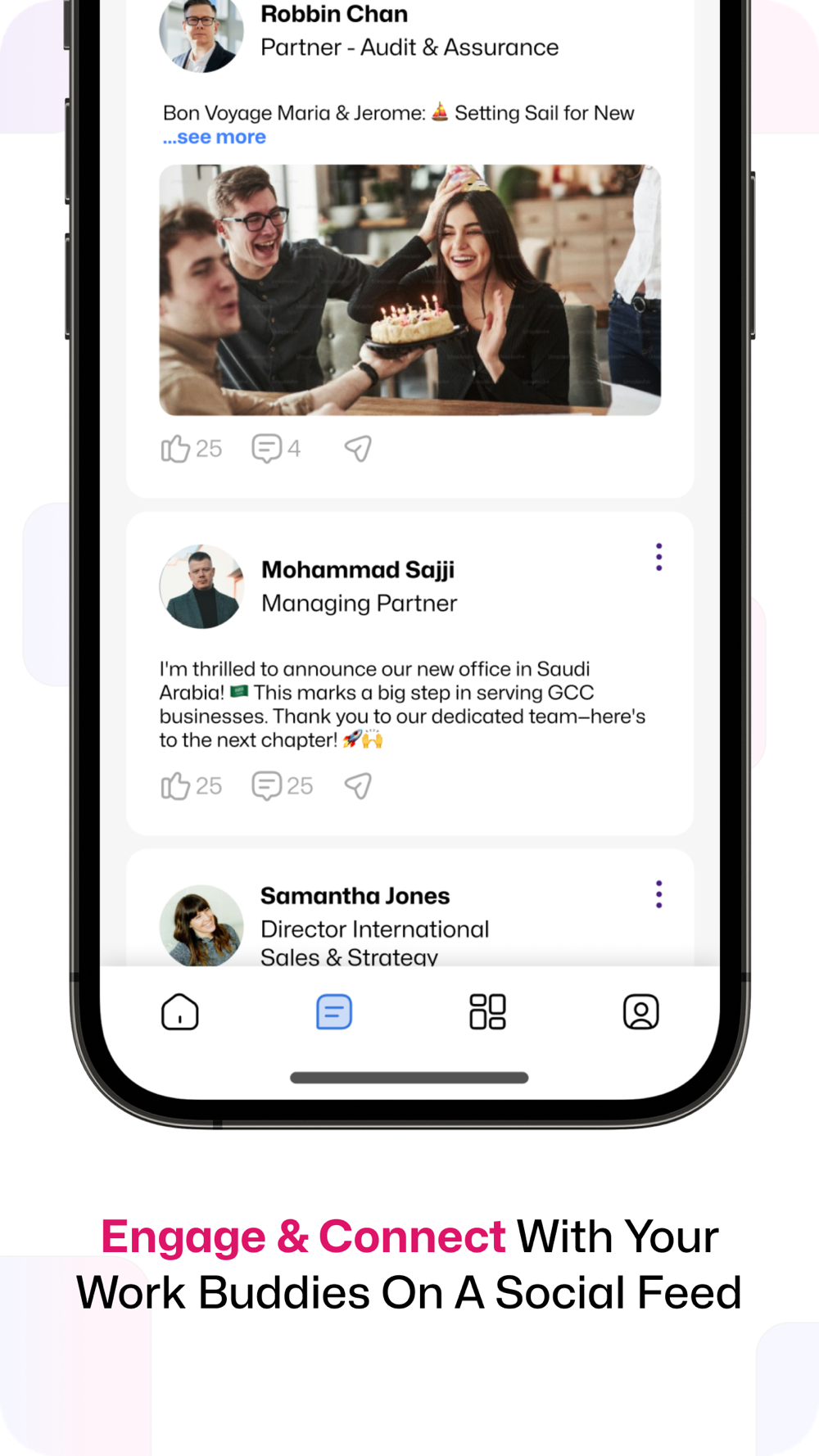 · Engage with colleagues through a social feed and stay updated with company events or public holidays.