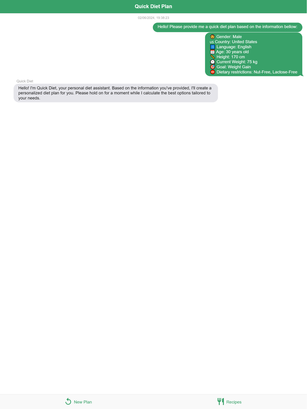- Get diet suggestions instantly with AI, just like a nutritionist would provide. Input your age, gender, dietary preferences, and goals, and receive a customized plan designed specifically for you.