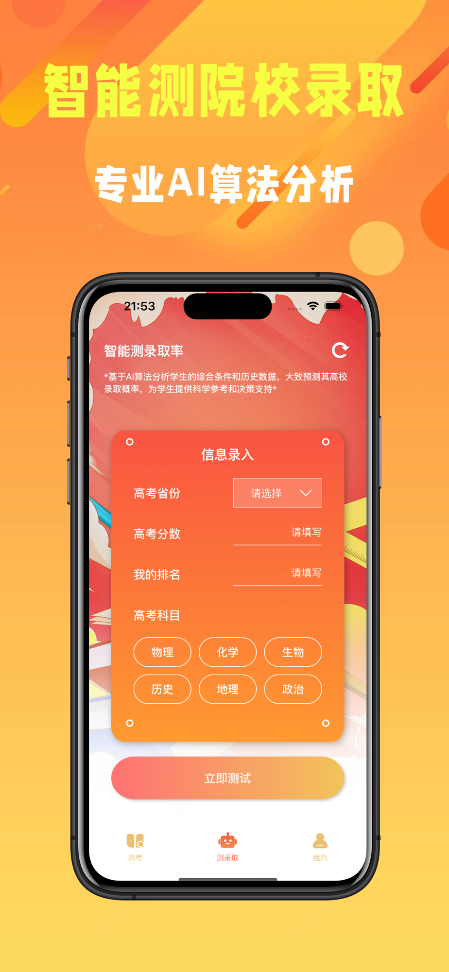 -- AI测录取率:利用先进的算法,结合历年数据分析,预测学生的录取概率,提供个性化的录取建议。
