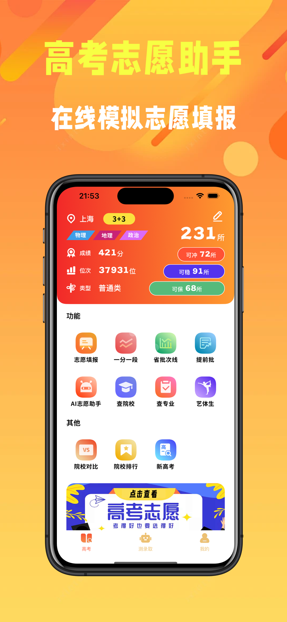 高考志愿助手是一款专为高考生设计的全面志愿填报辅助工具。本APP集成了多项功能,旨在帮助学生们科学、合理地选择高等院校和专业,最大限度地提升录取机会。无论是需要精确测算录取概率,还是寻找与个人分数相匹配的理想学校,在这里都能提供专业的指导和数据支持。