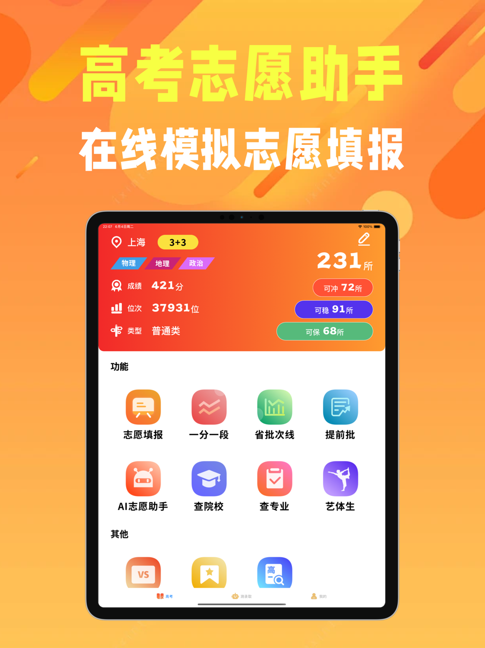 -- 智能填报志愿:基于学生的高考成绩,智能推荐“可冲刺”、“可稳妥”、“可保底”三类院校,帮助学生合理规划志愿列表,平衡风险与机会。