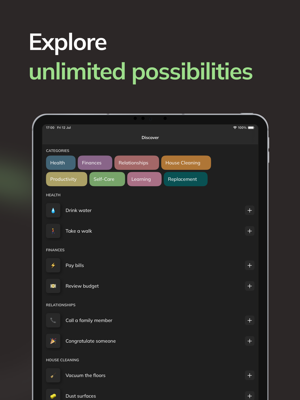 Kola is focused on working on recurring/repeating tasks, but you can use it however you want: track your habits, organize your chores, plan your routines. There is also a DISCOVER tab that helps you to get inspired.