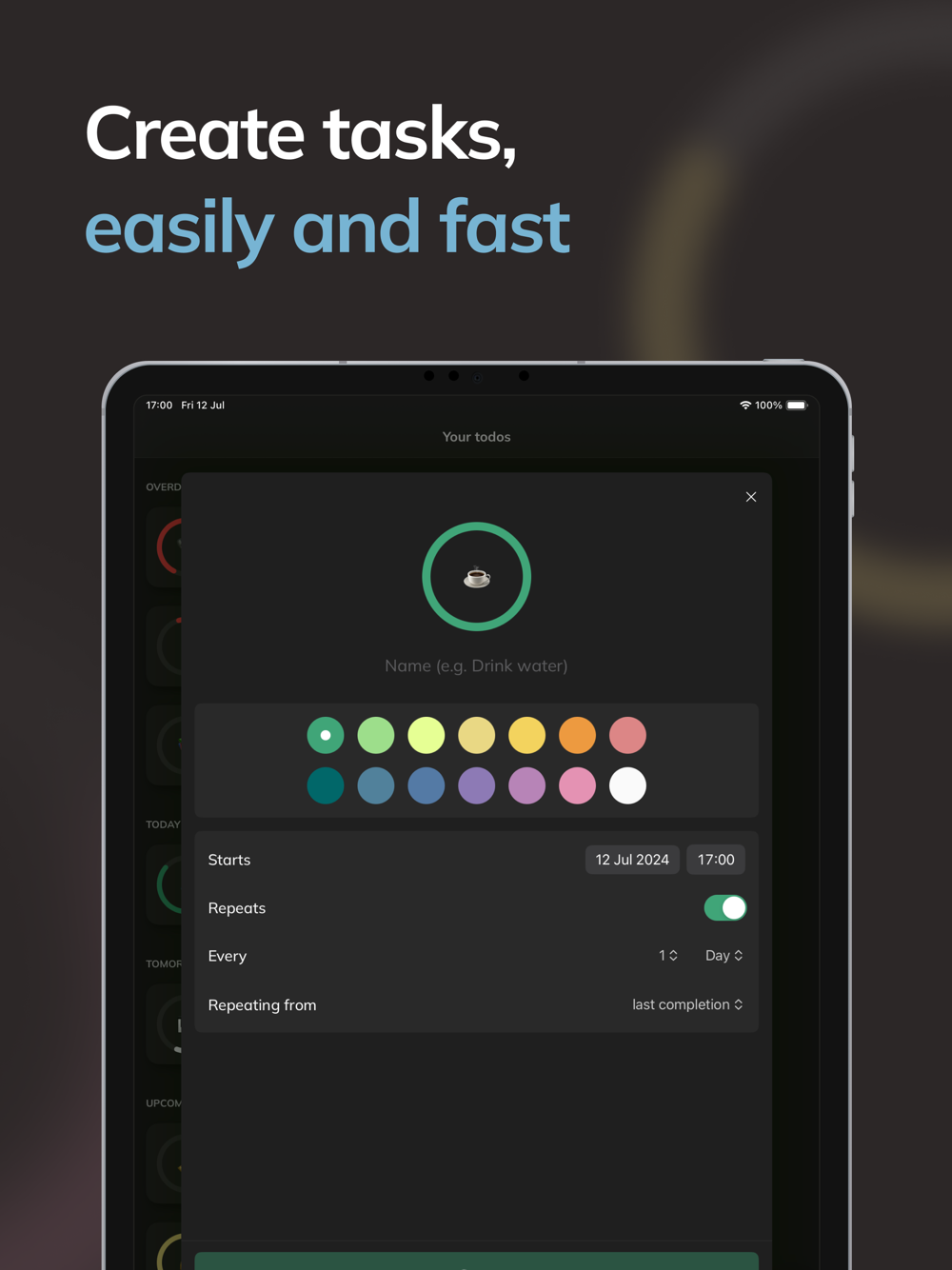 In Kola, you can choose any emoji or one of the native Apple icons to associate with your task. There are different colors, recurring type and other options to plan your schedule.