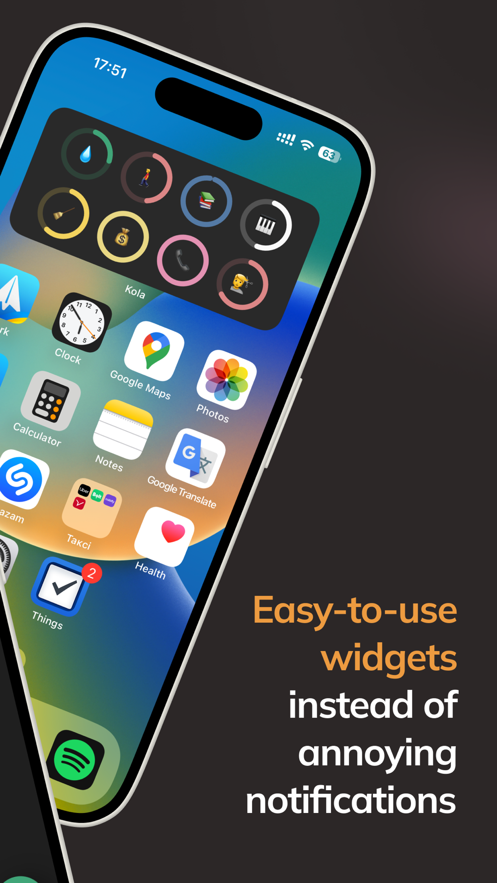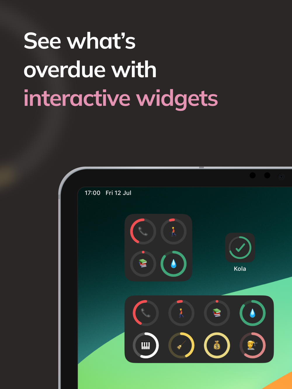 Kola is designed as an app for reminders without annoying notifications. Simple interactive widgets help you to see at a glance deadlines of your tasks, routines and chores. Kola provides an easy way to create recurring or one-time task, guaranteeing a smooth and intuitive experience.