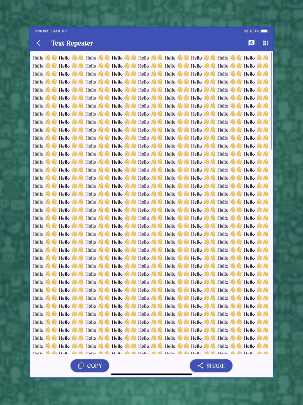 Unleash the power of repetition with Text Repeater: Repeat Text 10K! Need to generate massive amounts of repeated text for your project or experiment? Look no further! Whether you're a developer testing your app's scalability, a creative mind exploring patterns, or just someone who needs to repeat text thousands of times, this app has got you covered.