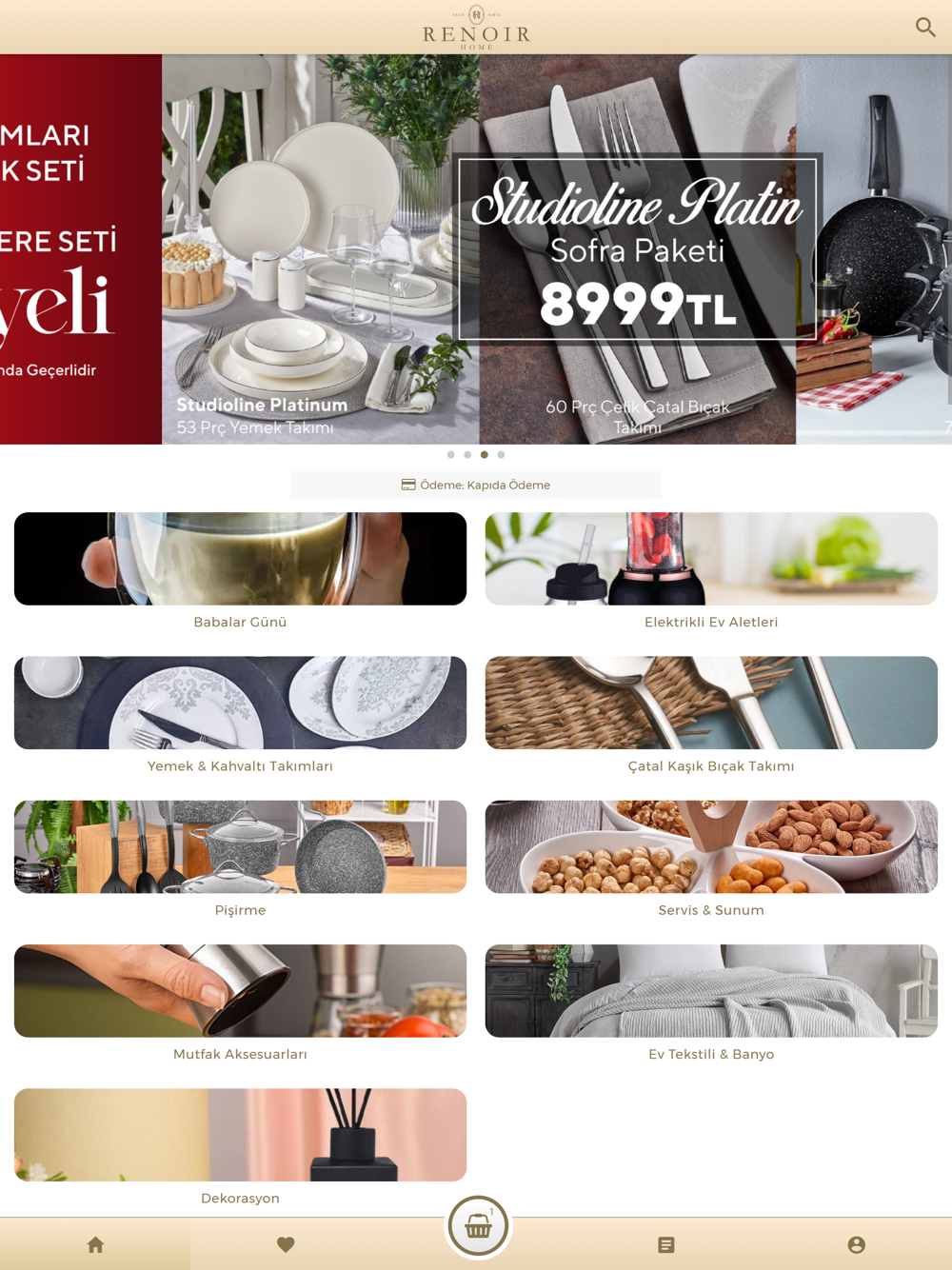 Renoir Home Mobil Uygulaması ile Elektrikli Ev Aletleri, Yemek ve Kahvaltı Takımları, Çatal Kaşık Bıçak Takımları, Pişirme, Servis & Sunum, Mutfak Aksesuarları, Ev Tekstili & Banyo, Dekorasyon vb. gibi daha birçok ürün kategorilerinde yepyeni ürünleri sizler ile buluşturuyoruz.