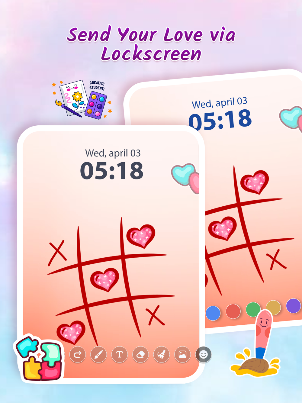Love Lockscreen Drawing allow users to draw directly on LockScreen or within LockScreen and Drawing Widget itself in amazing ways real time. User can also send message directly on LockScreen. It also provides variety of exciting backgrounds, Emoji Stickers, Wallpapers specially designed for "Games" like Tic Tac Toe to inspire and fuels your creativity for lockscreen paint.