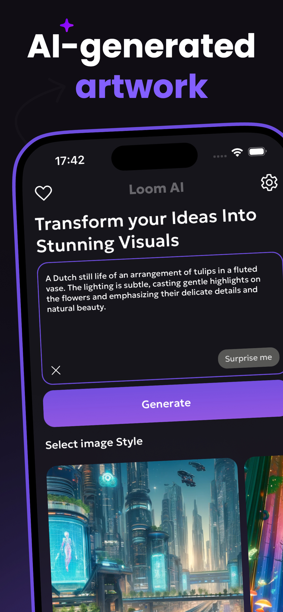 With Loom AI, experience the future of art creation. Transform your thoughts into extraordinary images and share your vision with the world. Download Loom AI today and start creating!