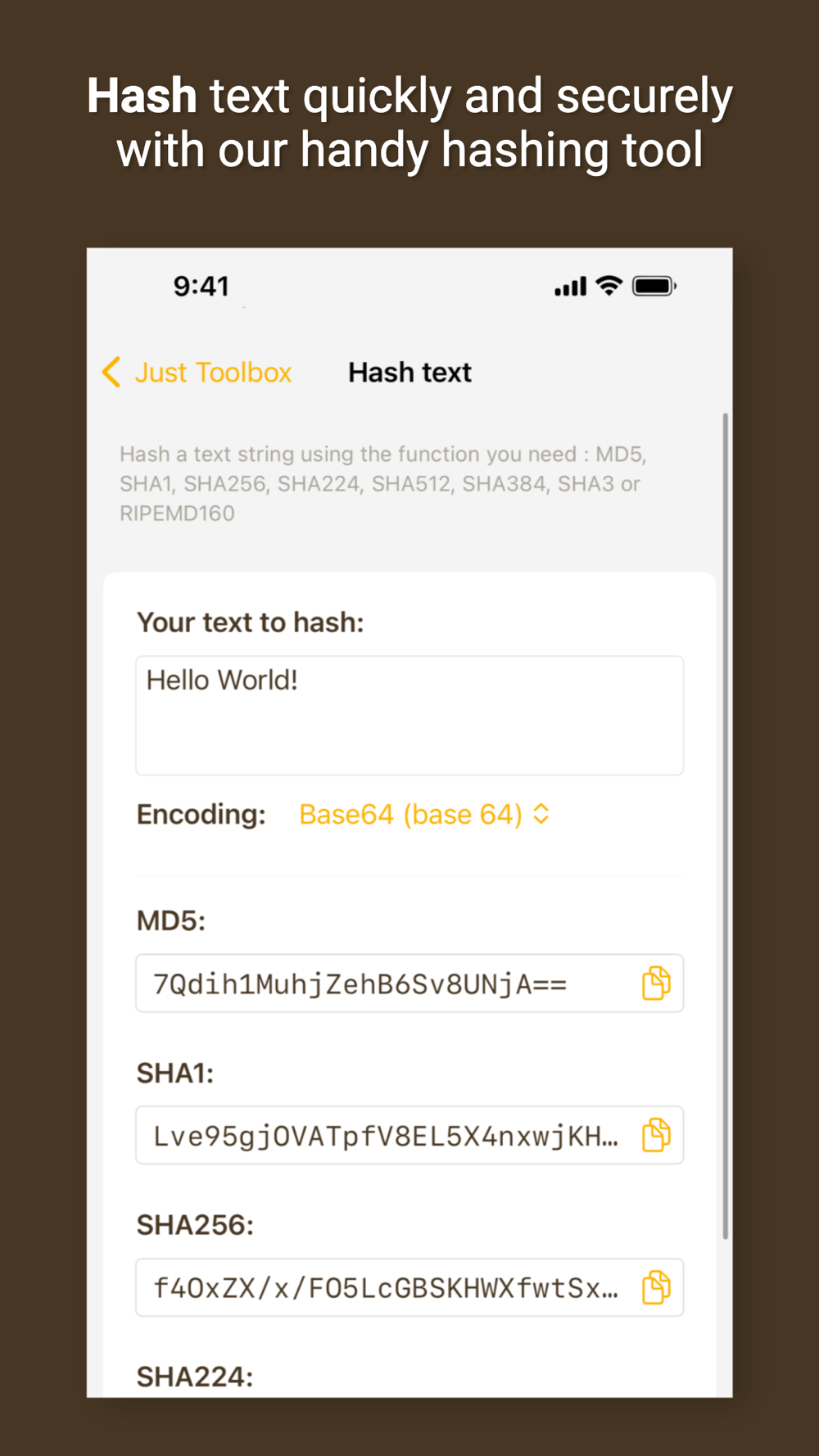* Hash text with MD5/SHA1/SHA256/SHA224/SHA512/SHA384/SHA3/RIPEMD160