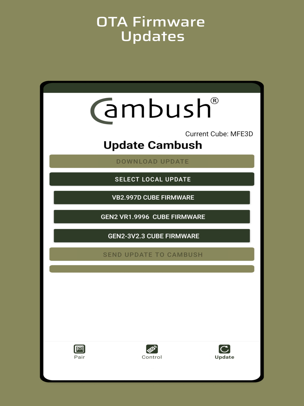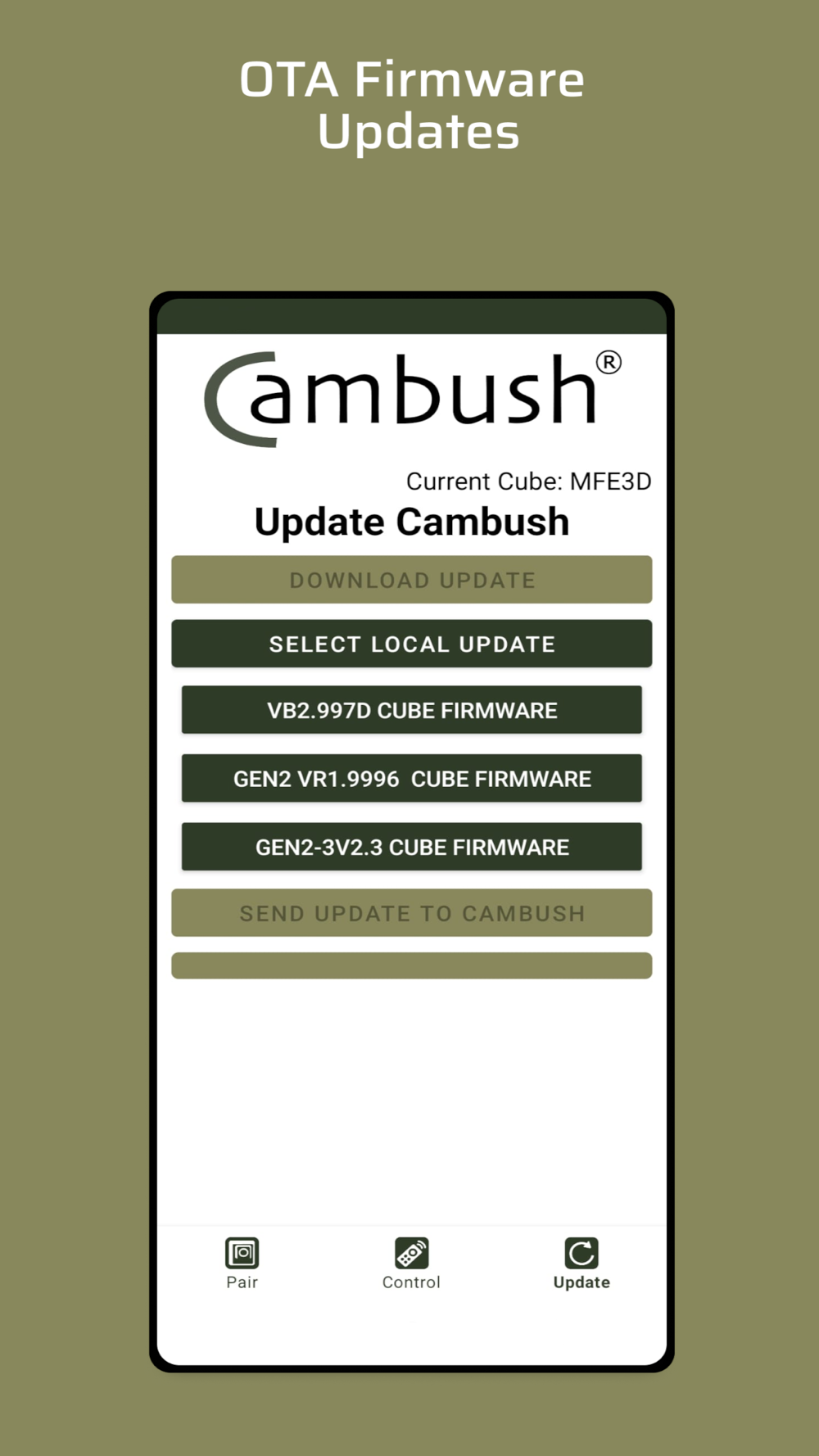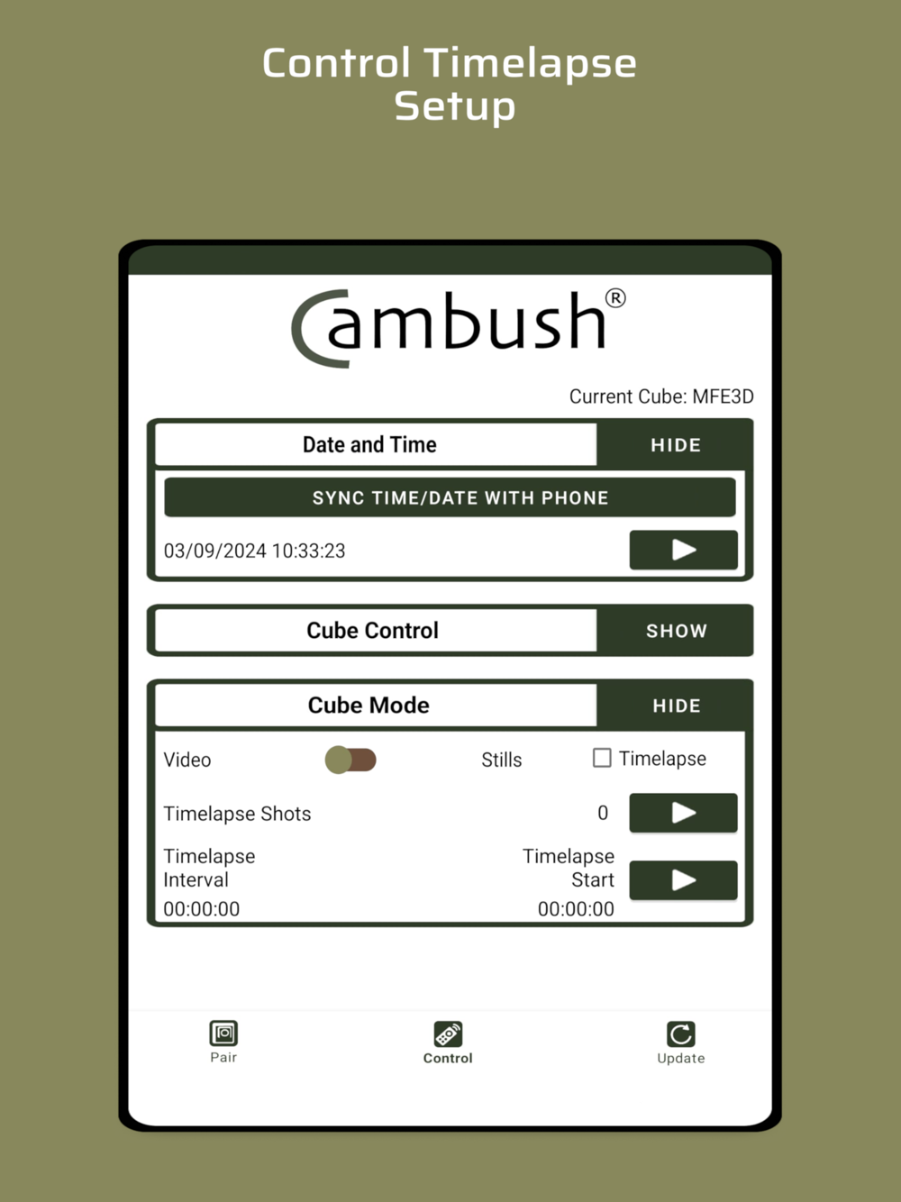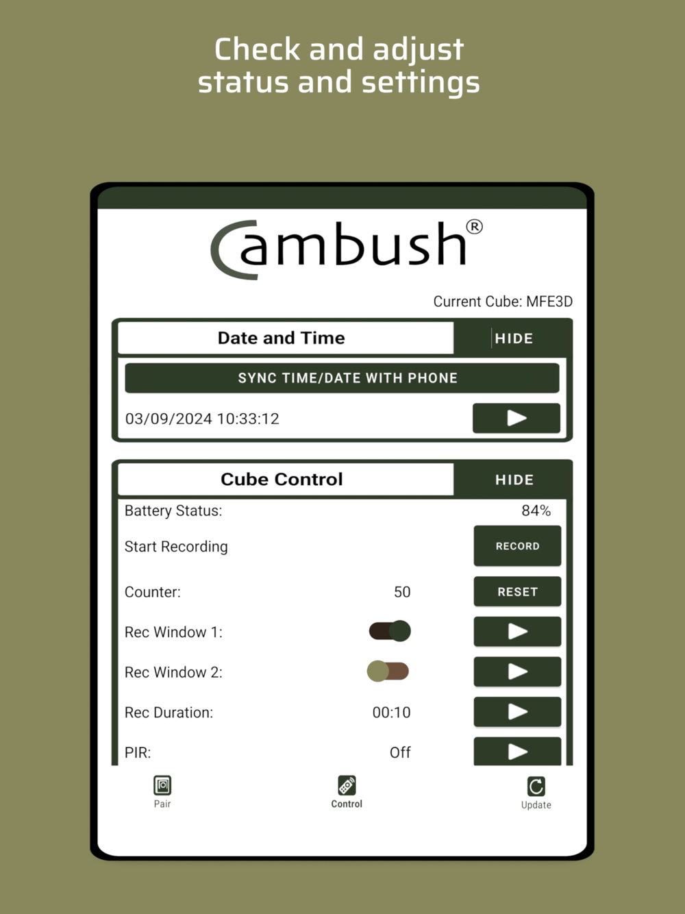 Switch camera modes between video and stills, set up recording windows or timelapses and configure the PIR sensor. The Cambush app also enables easy OTA firmware updating for your Cube, should it need it.