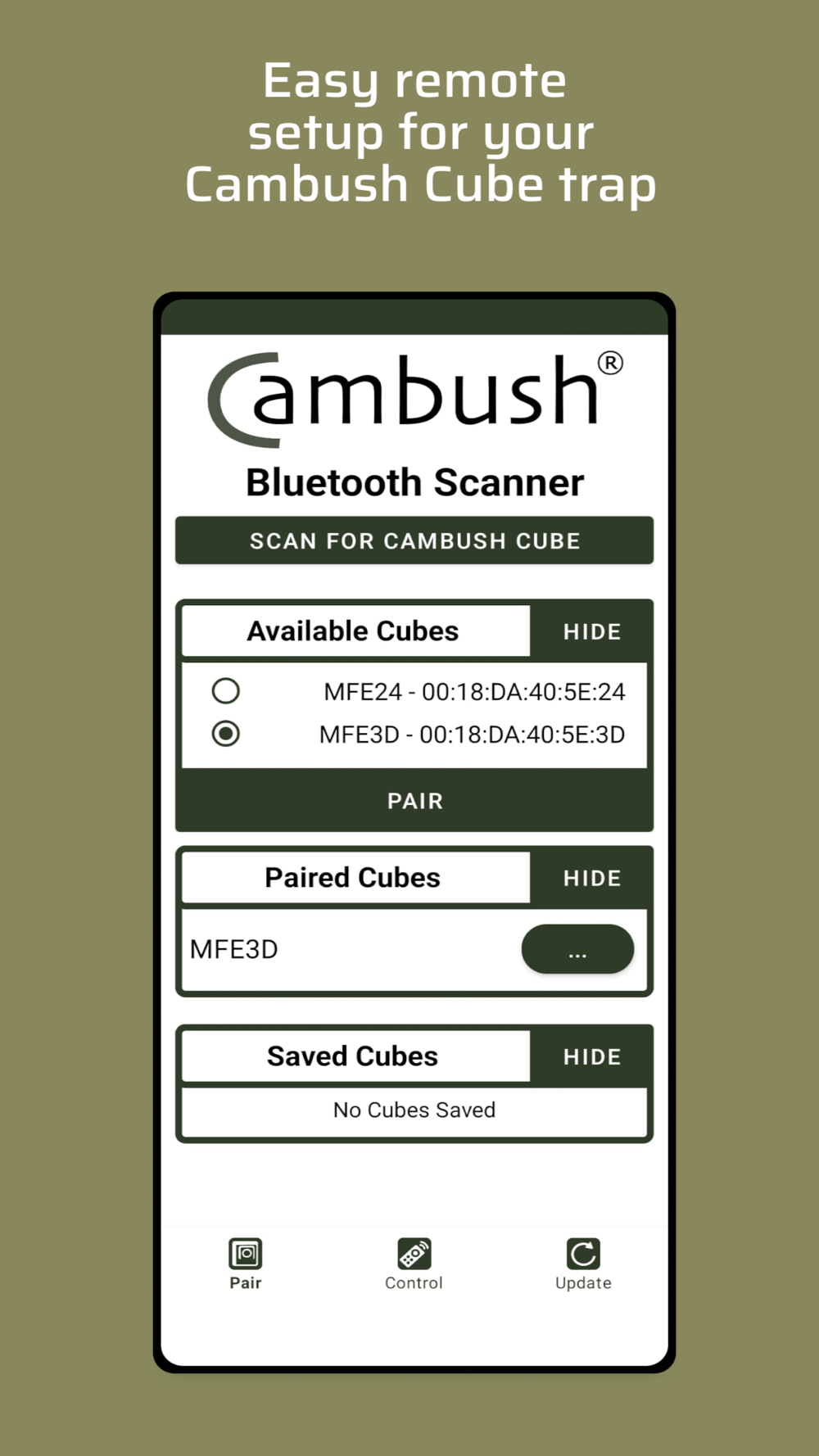 This application allows you to remotely connect to your Cambush Cube camera trap and gives you full control over all settings. In addition, you can easily sync your Cubes clock with your phone with a single press of a button. Use your phone to remotely start and stop recording*.