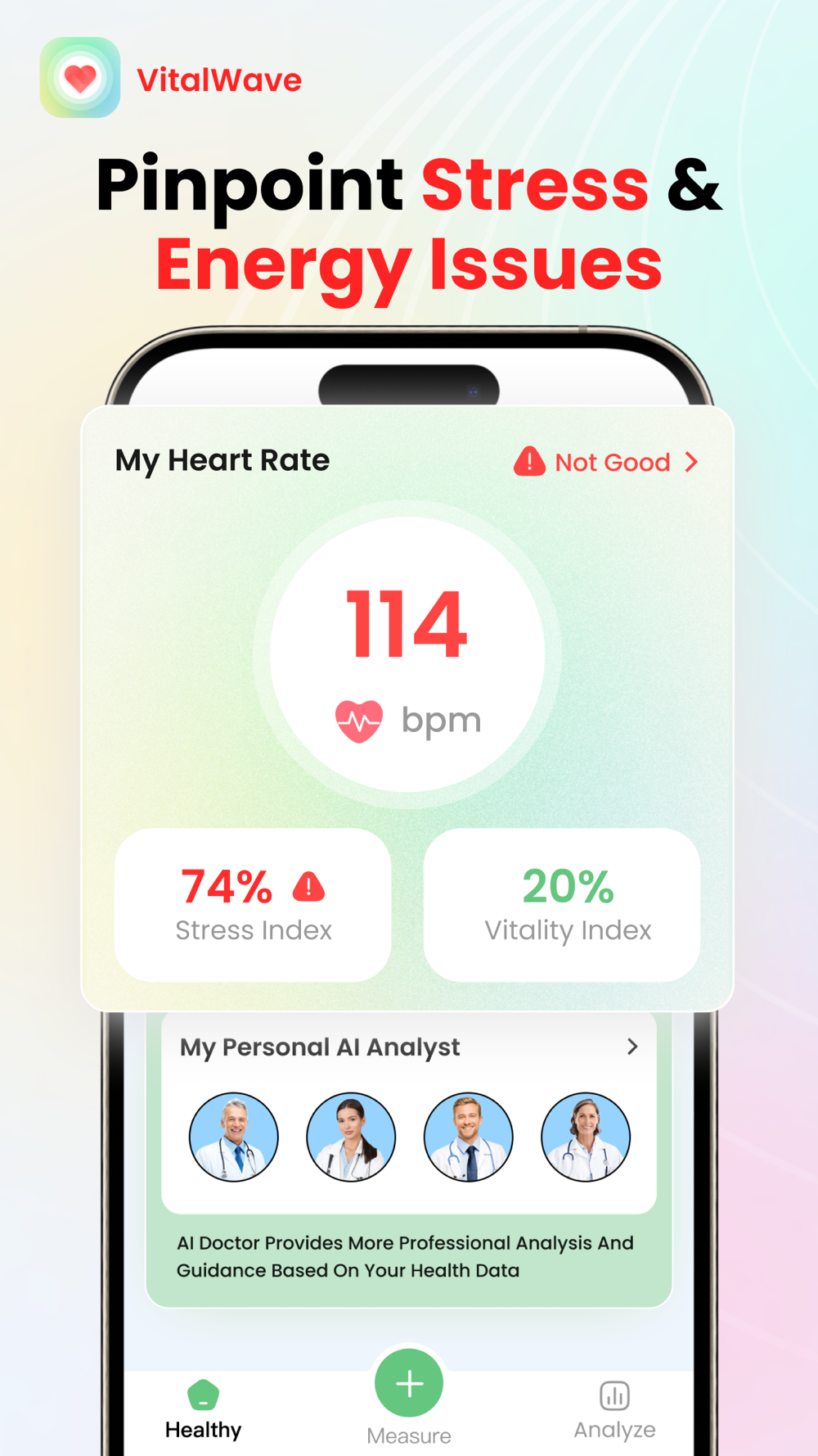 VitalWave is an app that can monitor and intelligently analyze heart rate anytime, combining the core advantages of immediacy in measurement, professional data, and intelligent analysis.