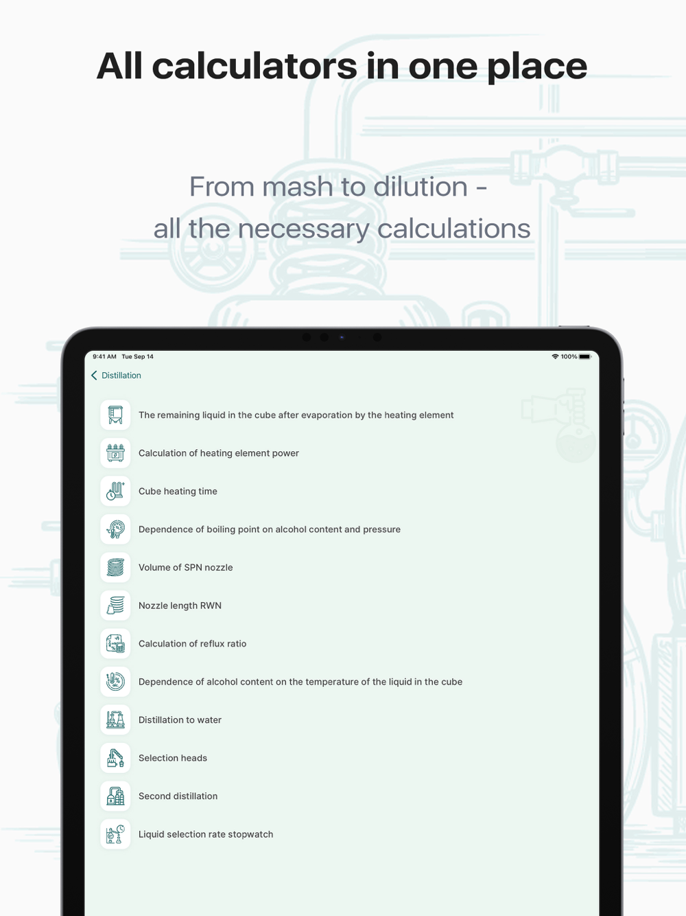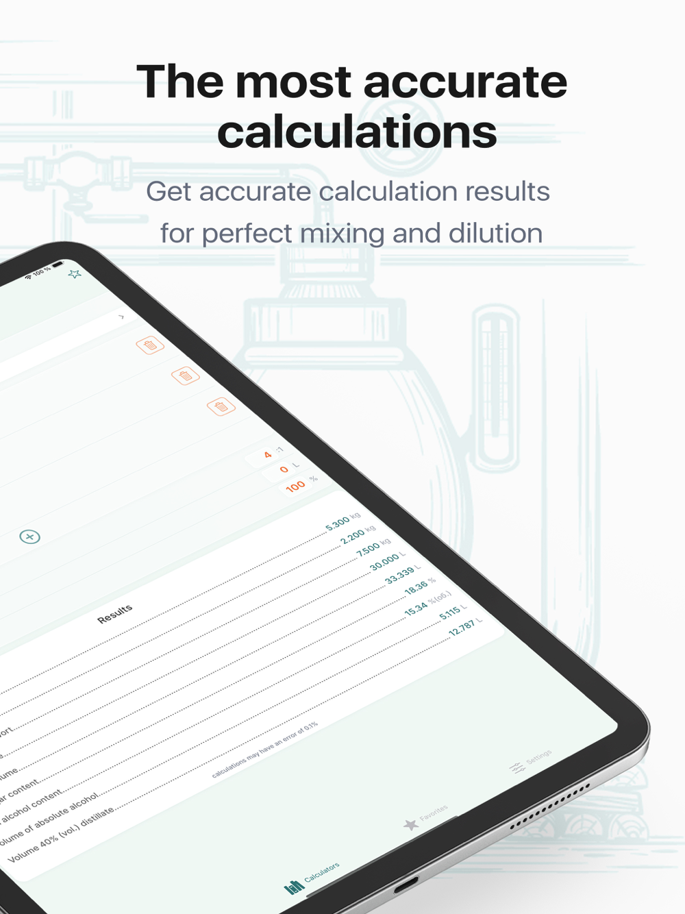 • Strength and dilution calculators: Accurate calculations to achieve the desired strength of your drink. Enter the initial data and receive the exact amount of water or alcohol for dilution.
