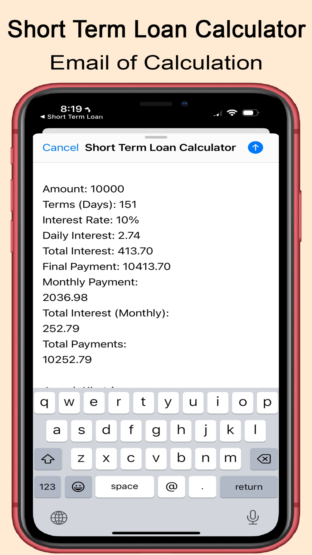 Short Term Loan Calculator for Personal Loan, Car Loan, Rehab of house loan and more. Very easy to use. You can save, email and text.