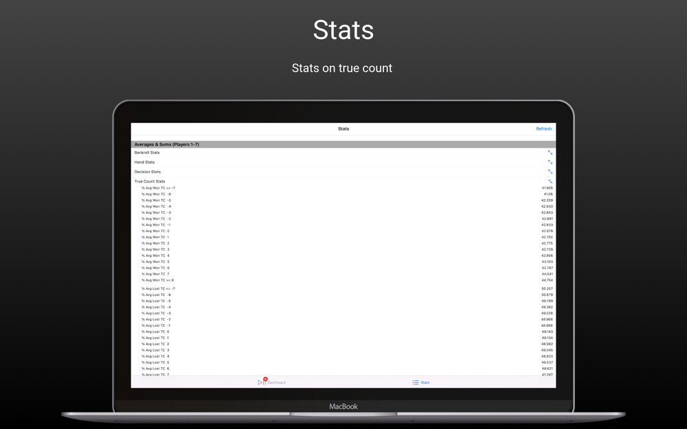 Detailed Statistics: Dive into your performance with stats on bankroll, decision making (hits, stands, etc.), hands won and lost, true count outcomes, and much more.