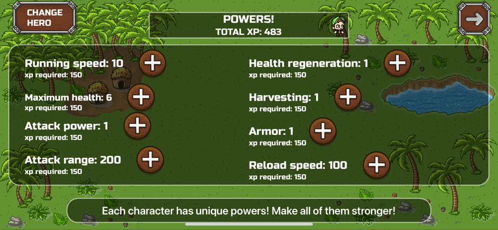 - Running Speed, Maximum Health, Attack Power, Attack Range, Health Regeneration, Harvesting, Armor, Reload Speed