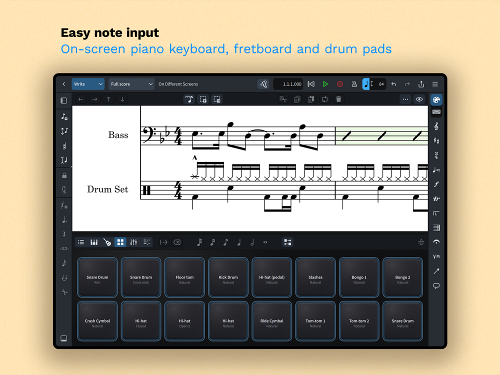 Compose your own music with Dorico. Create beautiful music notation for any number of instruments quickly and easily with the on-screen keyboard, drum pads and fretboard. Play back instantly with the included sounds, including the high-quality Iconica Sketch sound library, and shape the performance with powerful MIDI editing tools. When your piece is finished, share it as PDF, audio or MusicXML, or print directly to your AirPrint-enabled printer. Perform using the built-in read mode, and annotate with your Apple Pencil.