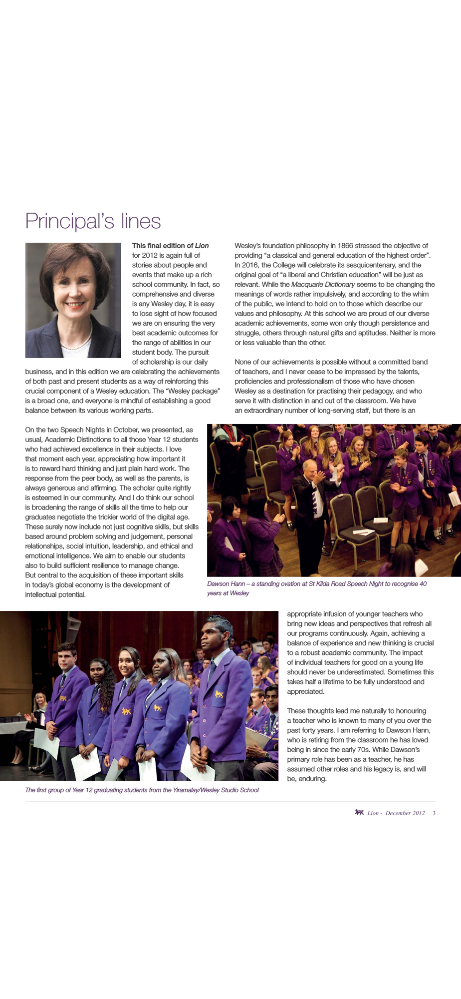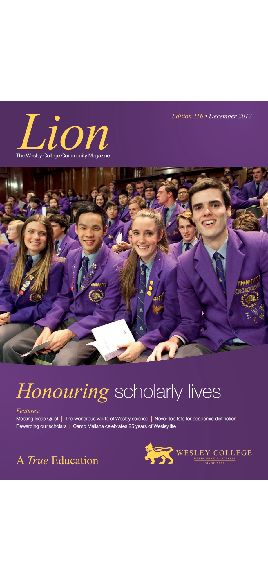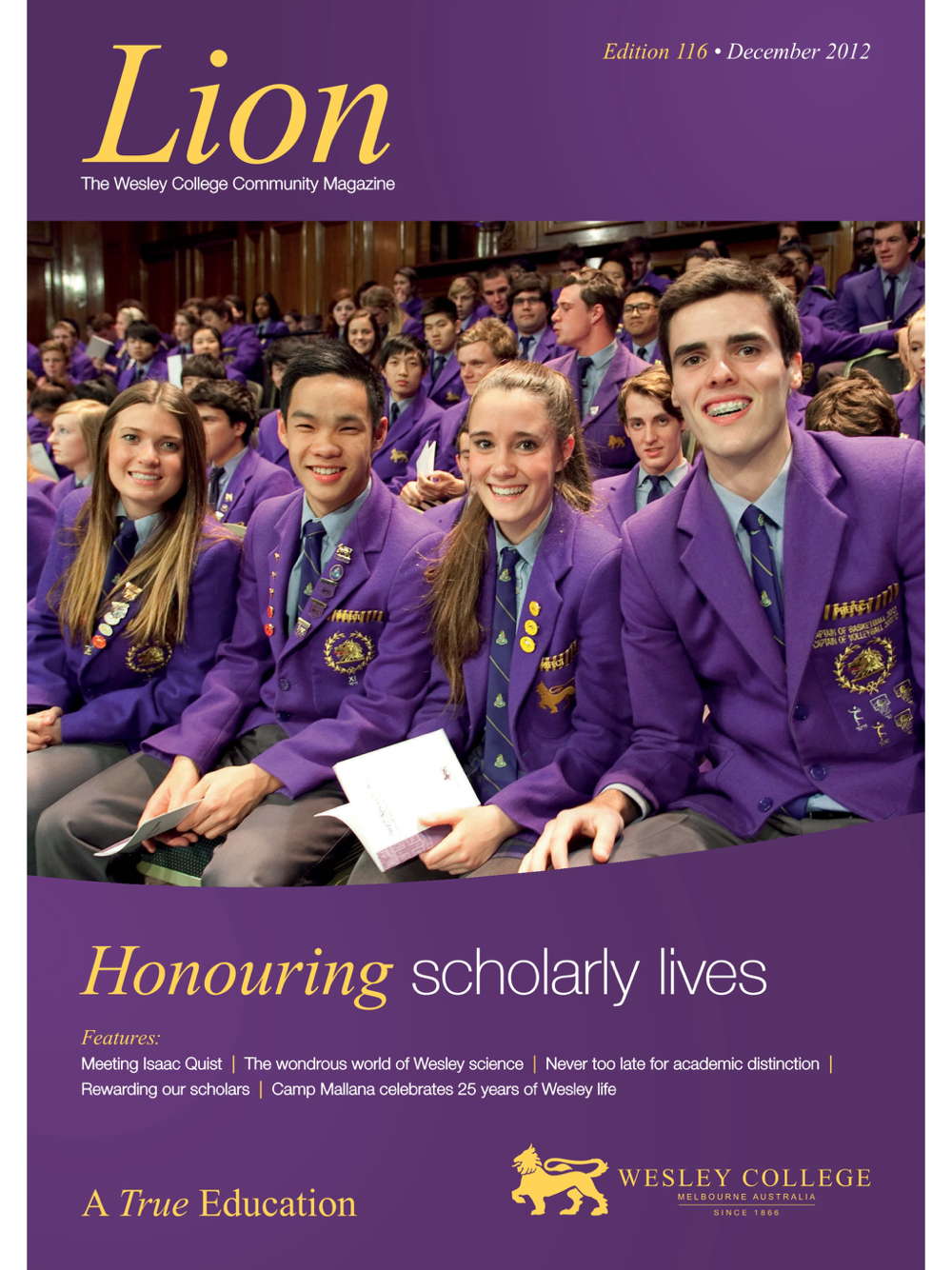 The Lion was first published in 1962 as the Wesley College community magazine. It is the College’s general news publication and each edition includes Old Wesley Collegians Association OWCA alumni news, information about the College and highlights student achievements. It is published two to three times per year and is distributed to all members of the Wesley community.
