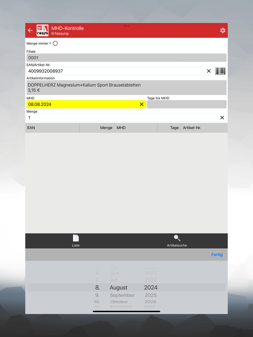 Die Artikelsuche erleichtert das Auffinden von Artikeln, sodass einzelne Mindesthaltbarkeitsdaten bei Bedarf überprüft werden können.