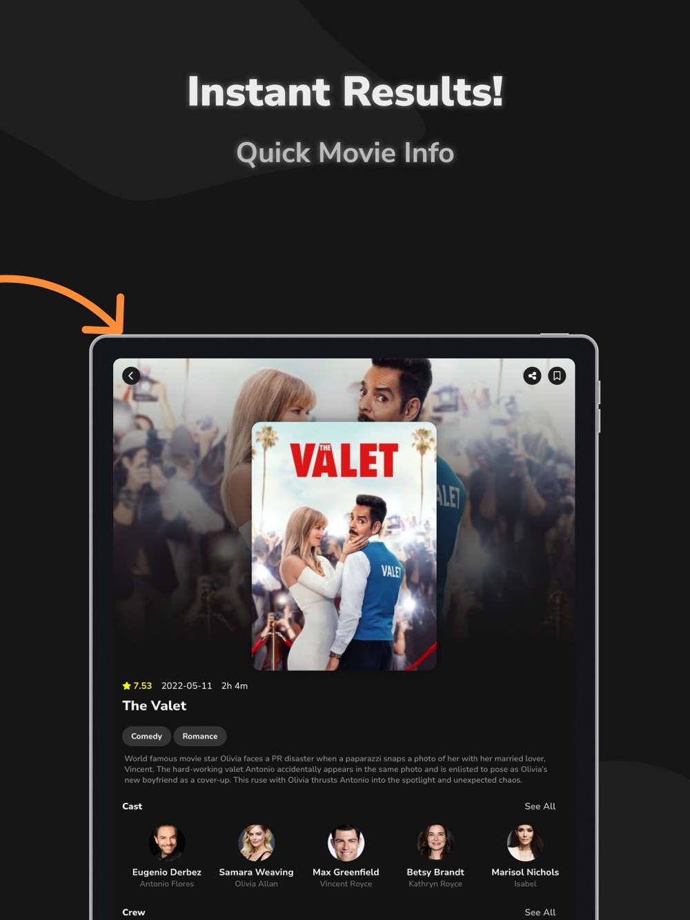 - Tap to Search: Snap a photo or video of any scene or actor, and get instant results for the movie or series.