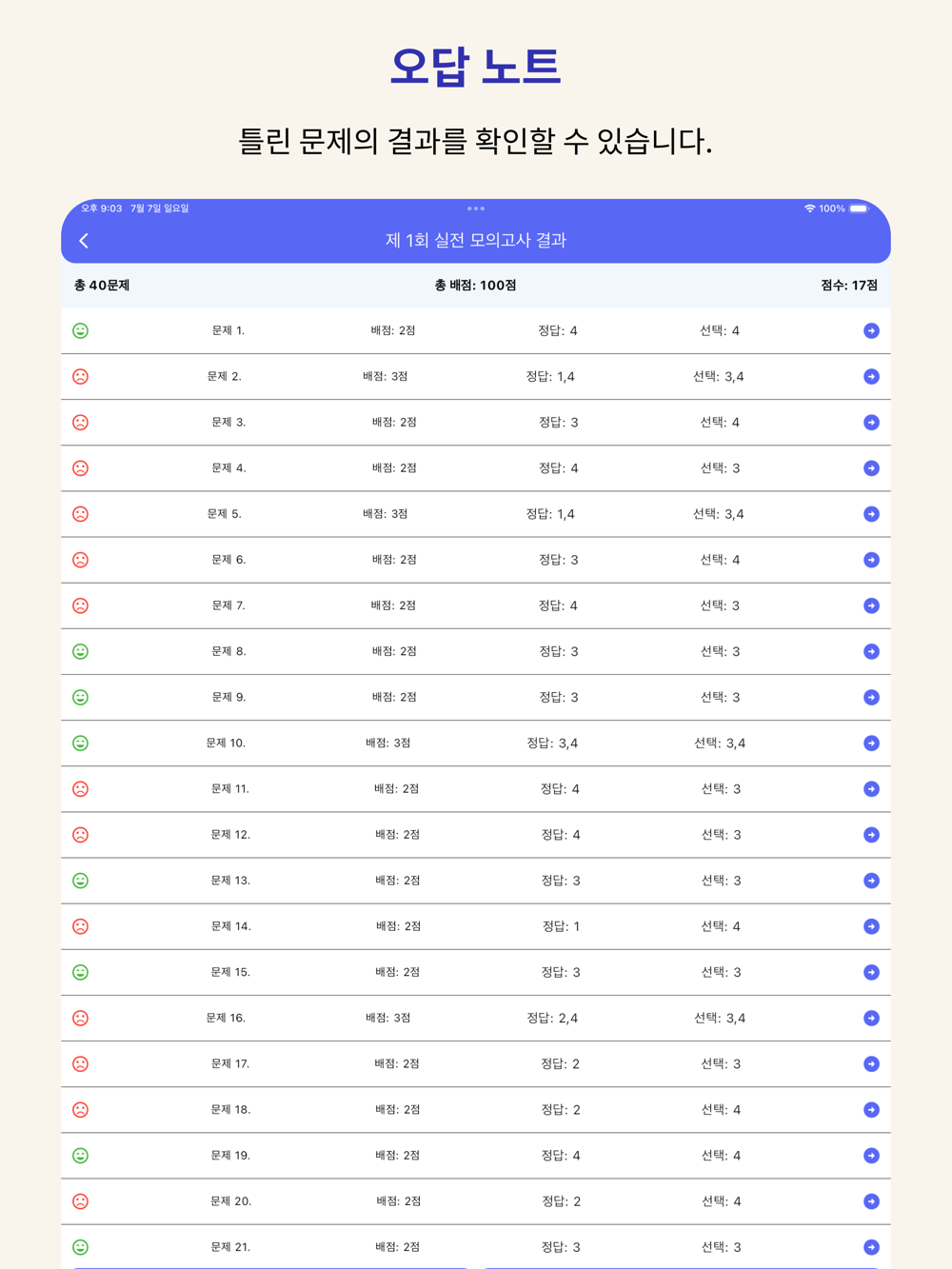 오답 노트: 틀린 문제를 확인할 수 있습니다.