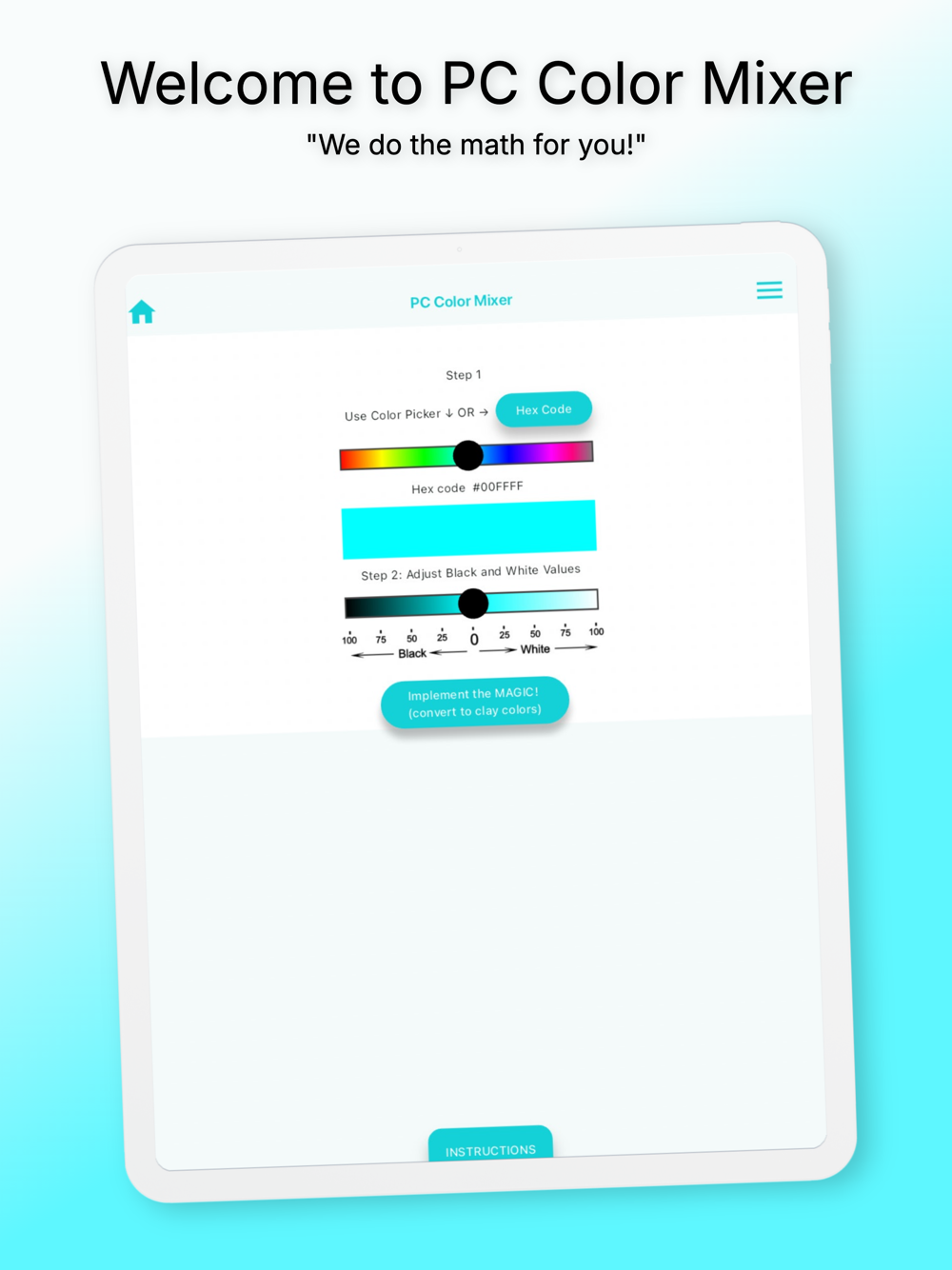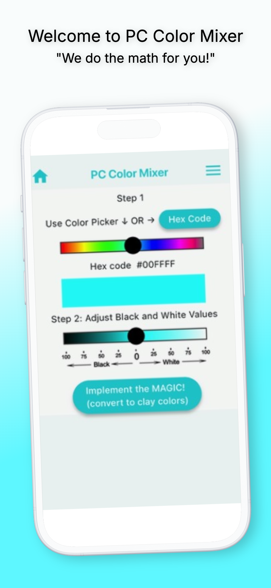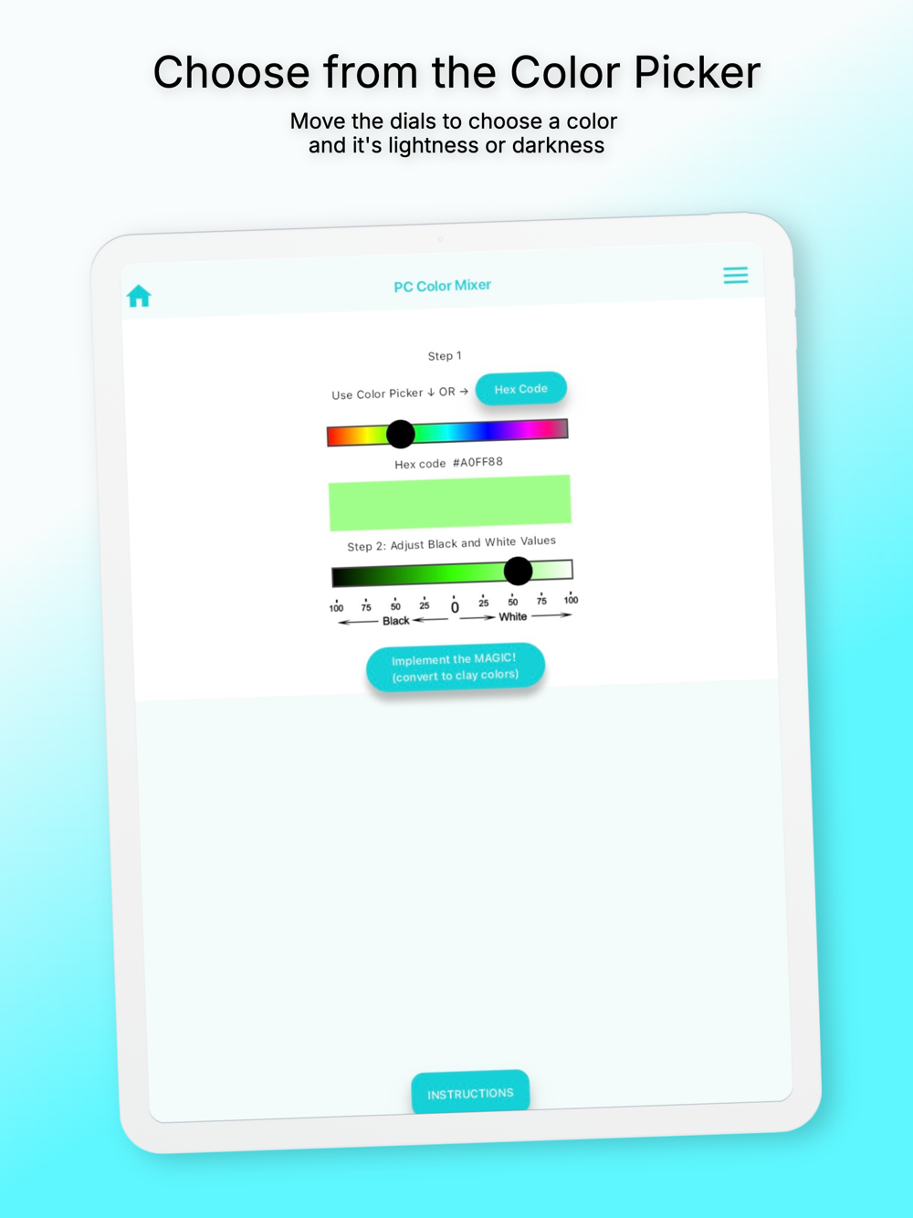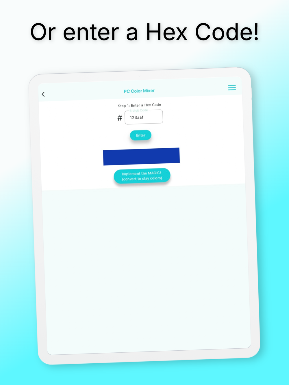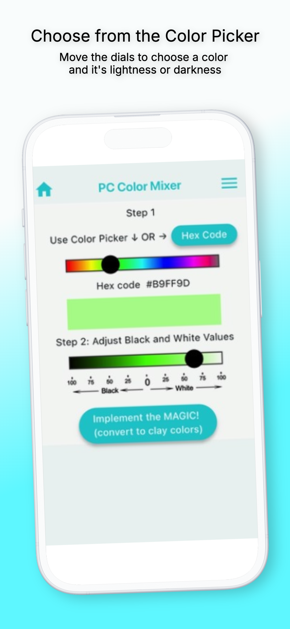 The color to be mixed can be selected by entering its 6 digit hex code or using the handy Color Picker in the app.