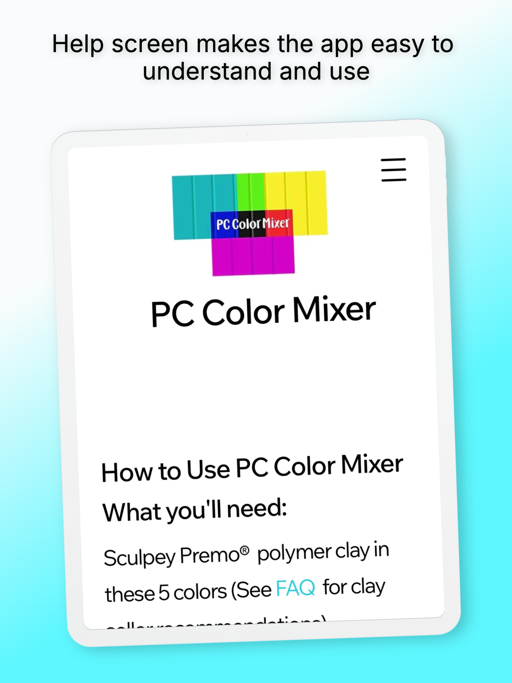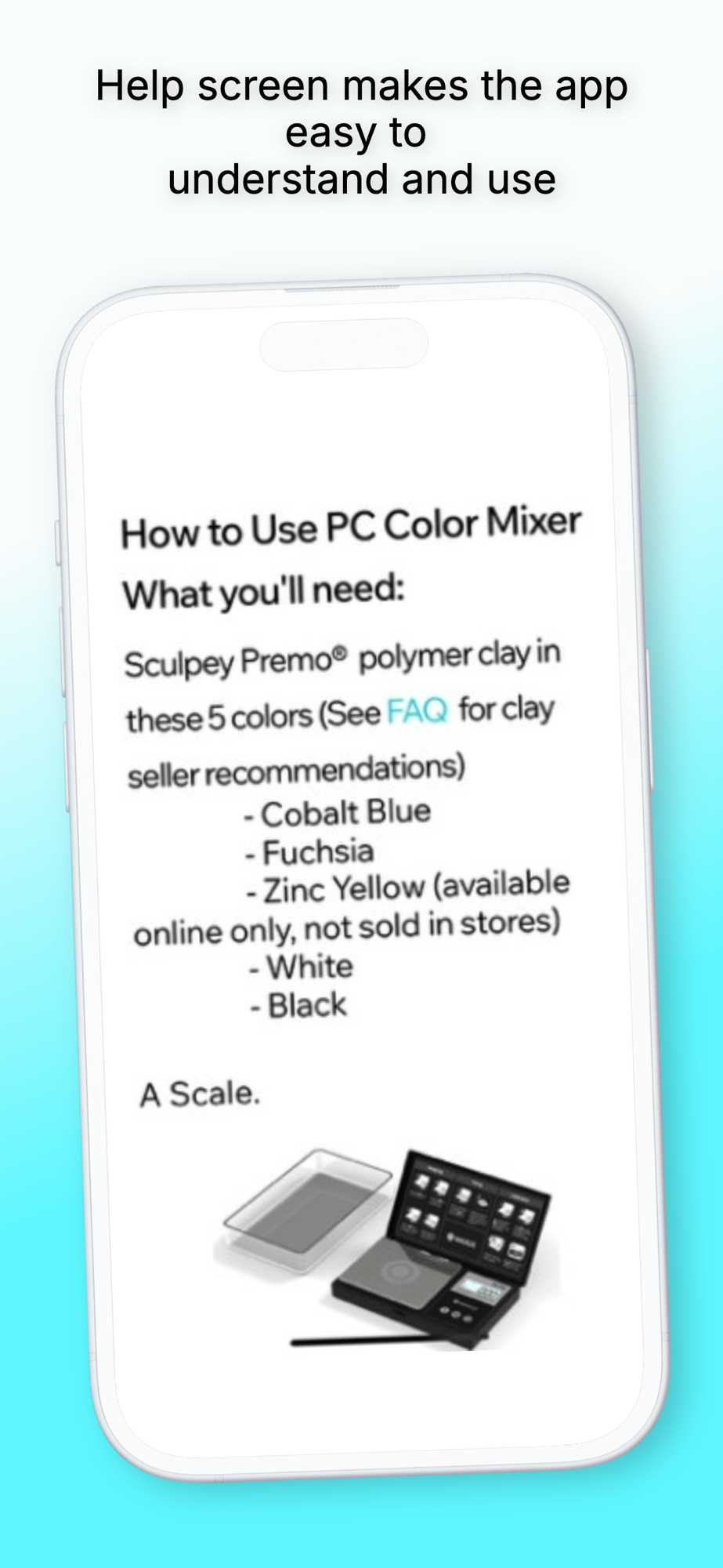 For suggestions on where to buy a scale or the necessary Sculpey Premo® clay colors, or ideas on where to find good color palettes and hex codes to use: www.pccolormixer.com/help