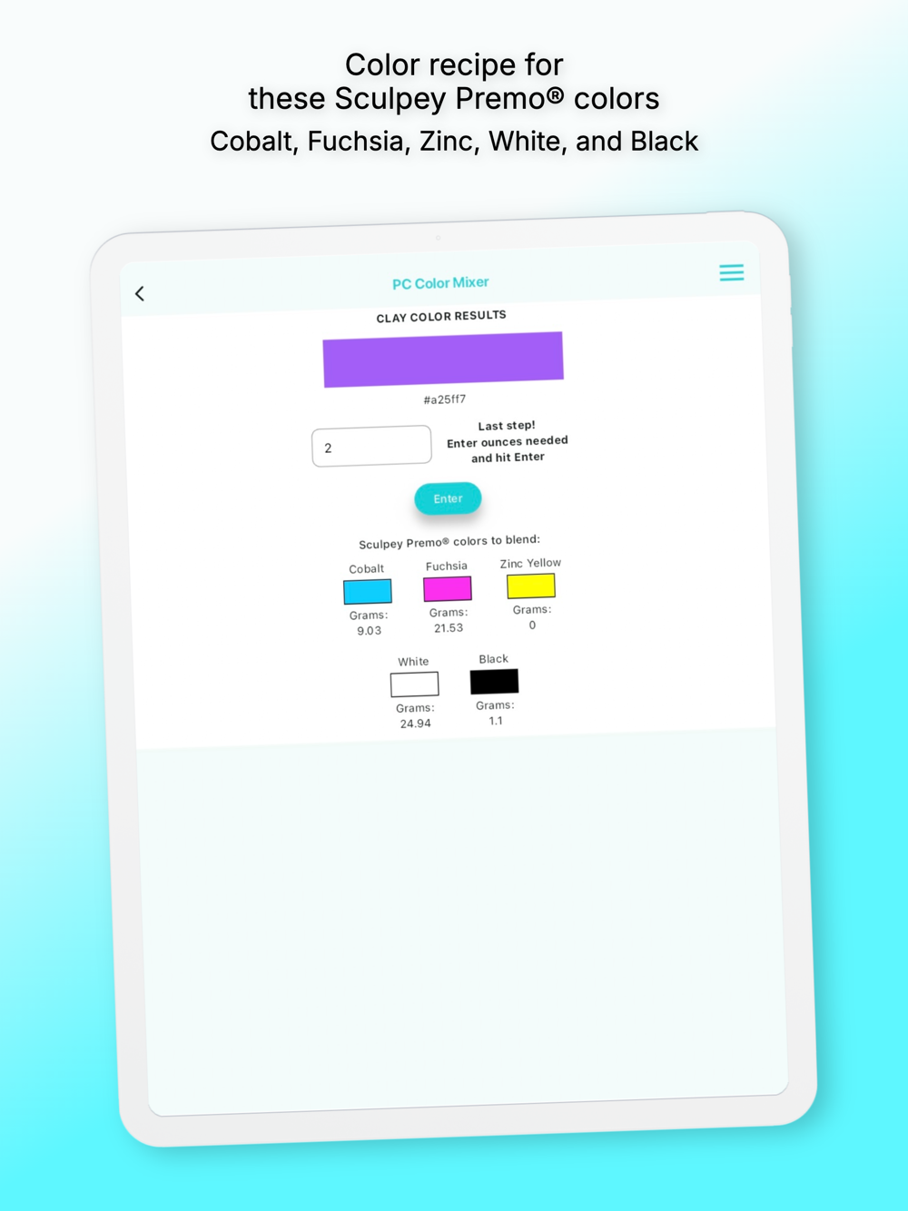 The user designates the amount of clay desired (in ounces) and the app goes to work, does the math, and calculates the exact weight in grams of the 5 primary clay colors.