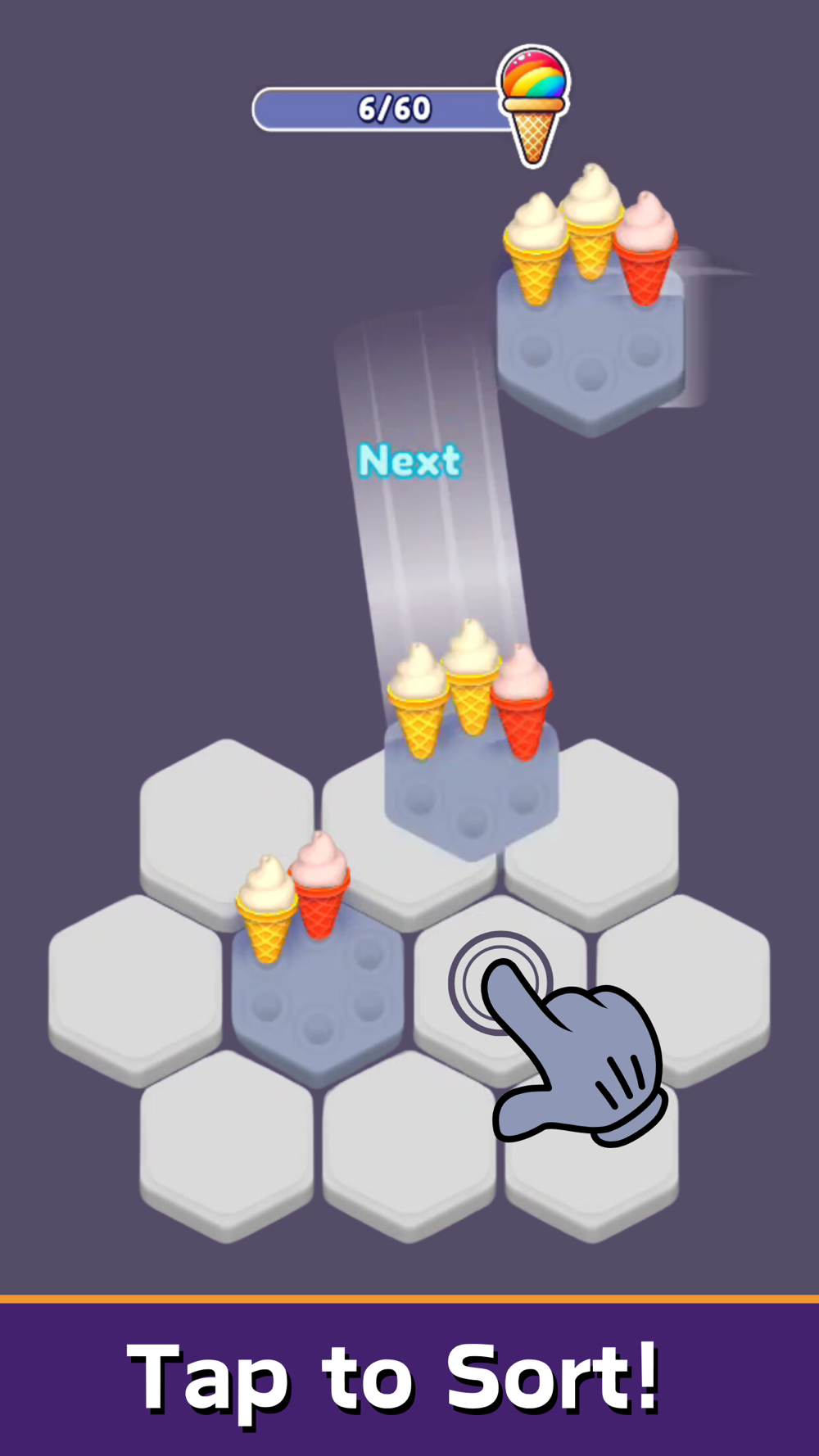 - Tap to Place: Simply tap to place ice cream boxes on the grid. Match ice creams of the same colour in a tray to sort them.