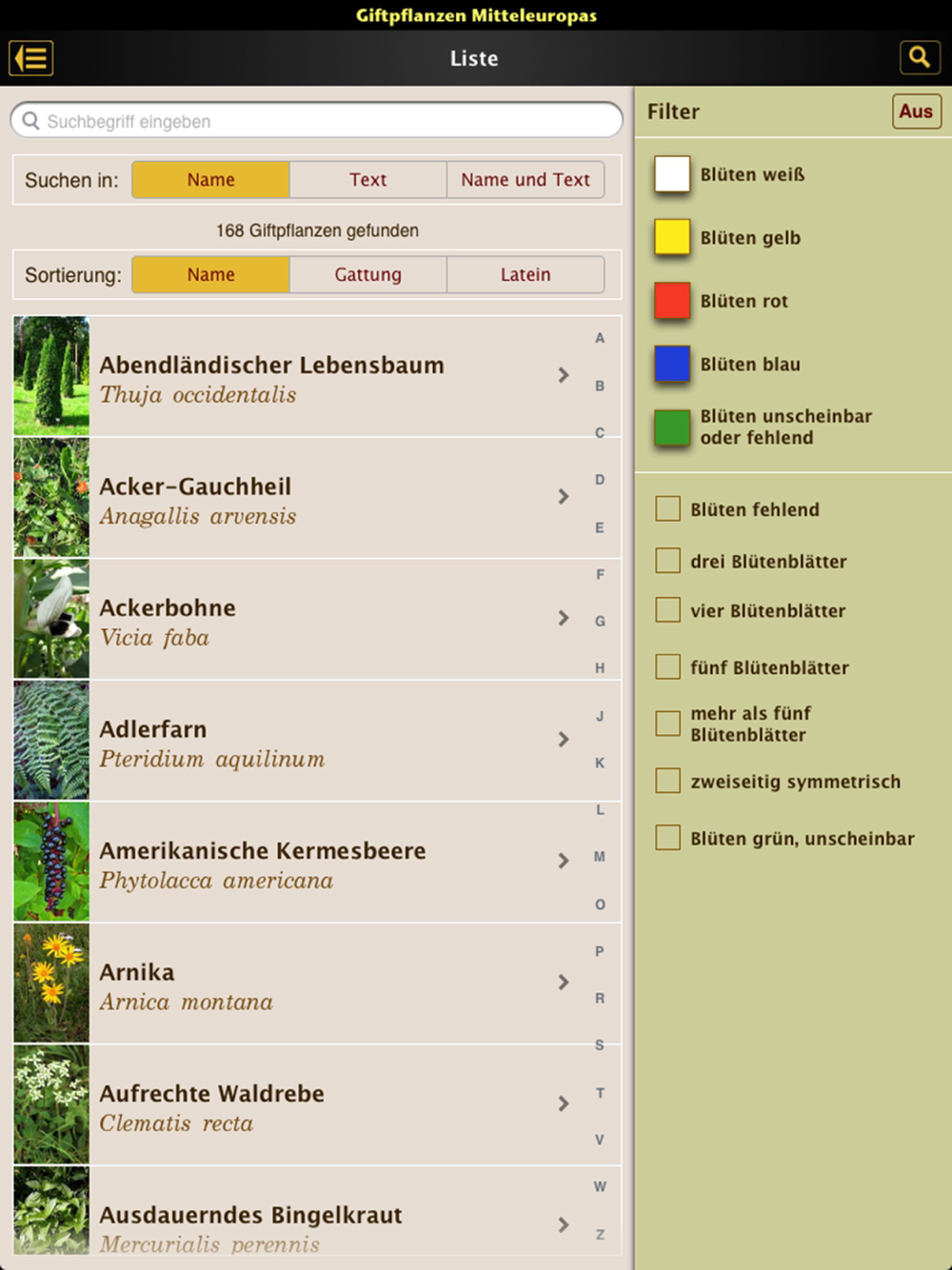 Mit dieser App haben Sie einen umfangreichen Pflanzenführer, mit dem Sie über 160 Giftpflanzen einfach und schnell identifizieren können. Eine intuitive grafische Benutzerschnittstelle, komfortable Suchfunktionen, Filter (nach Farbe und/oder Blütenformen) und hochaufgelöste, aussagekräftige Abbildungen zu allen Beschreibungen machen diese App zu einem wertvollen Begleiter.