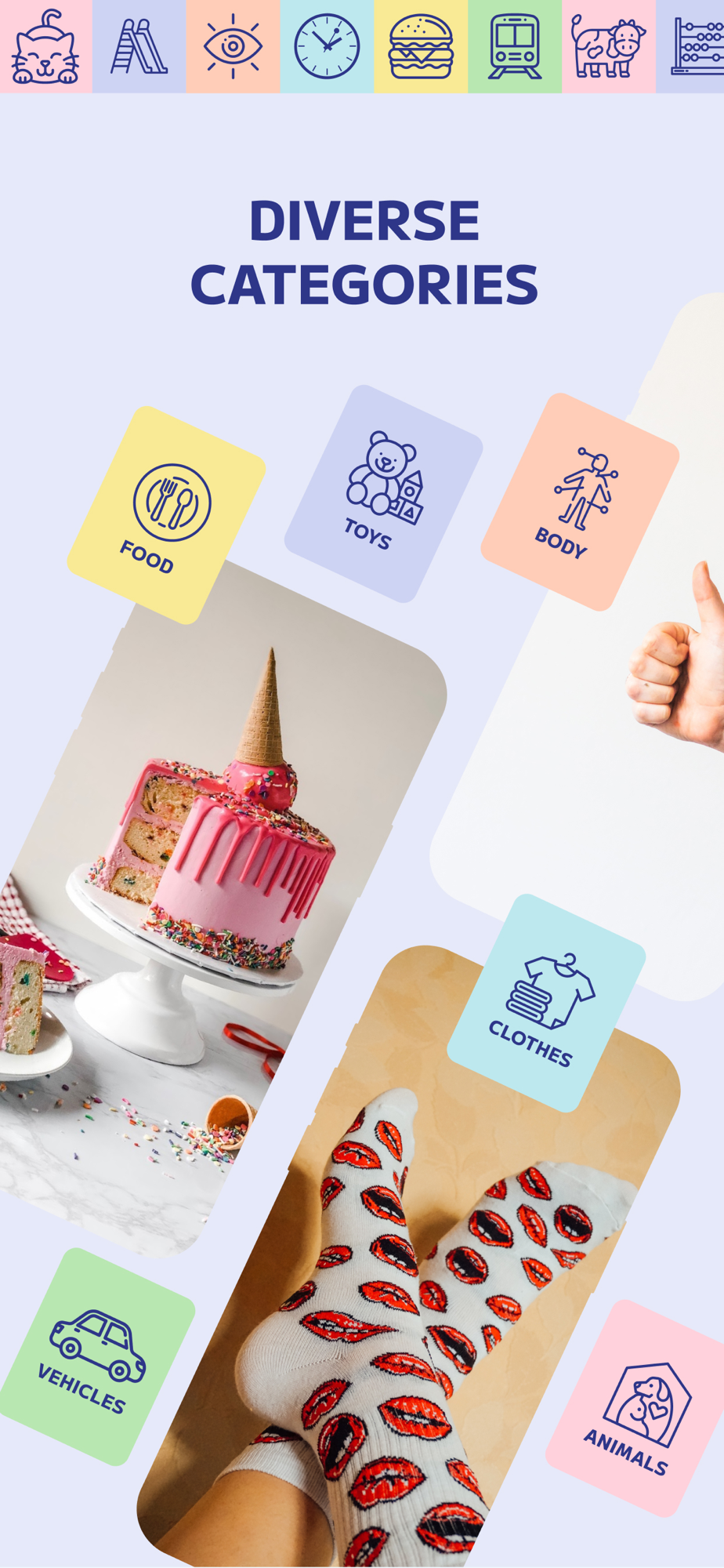 • 6 engaging categories: Food, Body, Vehicles, Toys, Clothes, and Animals